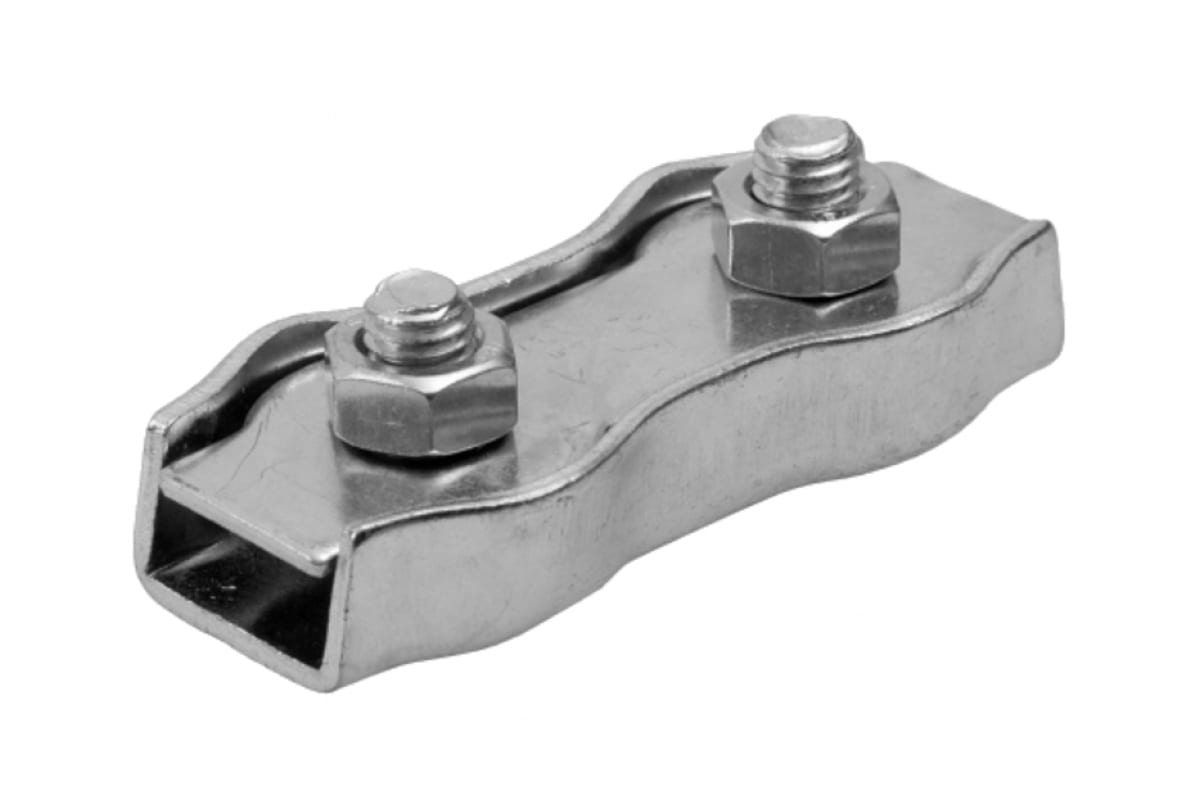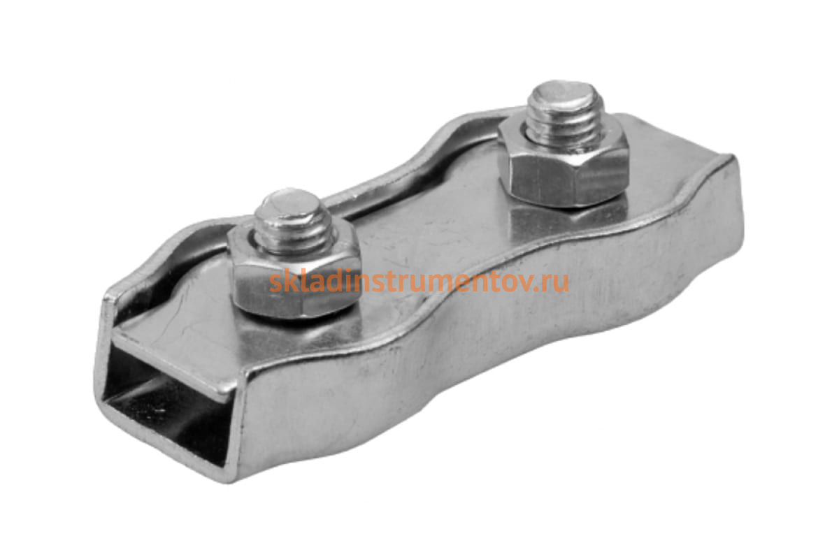 Зажим Зубр 4-304445-03 применяется для формирования петель на концах троса. Свободный конец троса помещается в зажим, а затем в полученную петлю закладывается коуш, после которого трос помещается с другой стороны винта. Необходимо, чтобы конец троса, помещаемый в зажим, выходил из него на расстояние не менее чем 1/2 диаметра троса. Сверху помещается прижимная пластина, и все соединение накрепко закручивается при помощи гаек. Зажим изготовлен из оцинкованной стали. Тип фасовки — ТФ5.