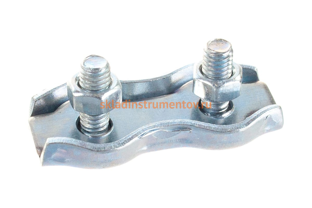Зажим Зубр 4-304445-04 применяется для формирования петель на концах троса. Свободный конец троса помещается в зажим, а затем в полученную петлю закладывается коуш, после которого трос помещается с другой стороны винта. Необходимо, чтобы конец троса, помещаемый в зажим, выходил из него на расстояние не менее чем 1/2 диаметра троса. Сверху помещается прижимная пластина, и все соединение накрепко закручивается при помощи гаек. Зажим изготовлен из оцинкованной стали. Тип фасовки — ТФ5.