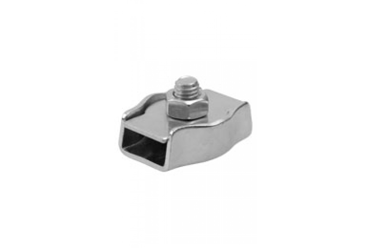 Зажим Зубр 4-304436-02 изготовлен из оцинкованной стали. Он необходим для формирования петель на концах троса. Свободный конец троса помещаем в зажим, а затем в полученную петлю закладываем коуш. Затем трос помещают с другой стороны винта. Необходимо, чтобы конец троса, помещаемый в зажим, выходил из него на расстояние не менее чем 1/2 диаметра троса. Сверху помещается прижимная пластина, и все соединение накрепко закручивается при помощи гаек.