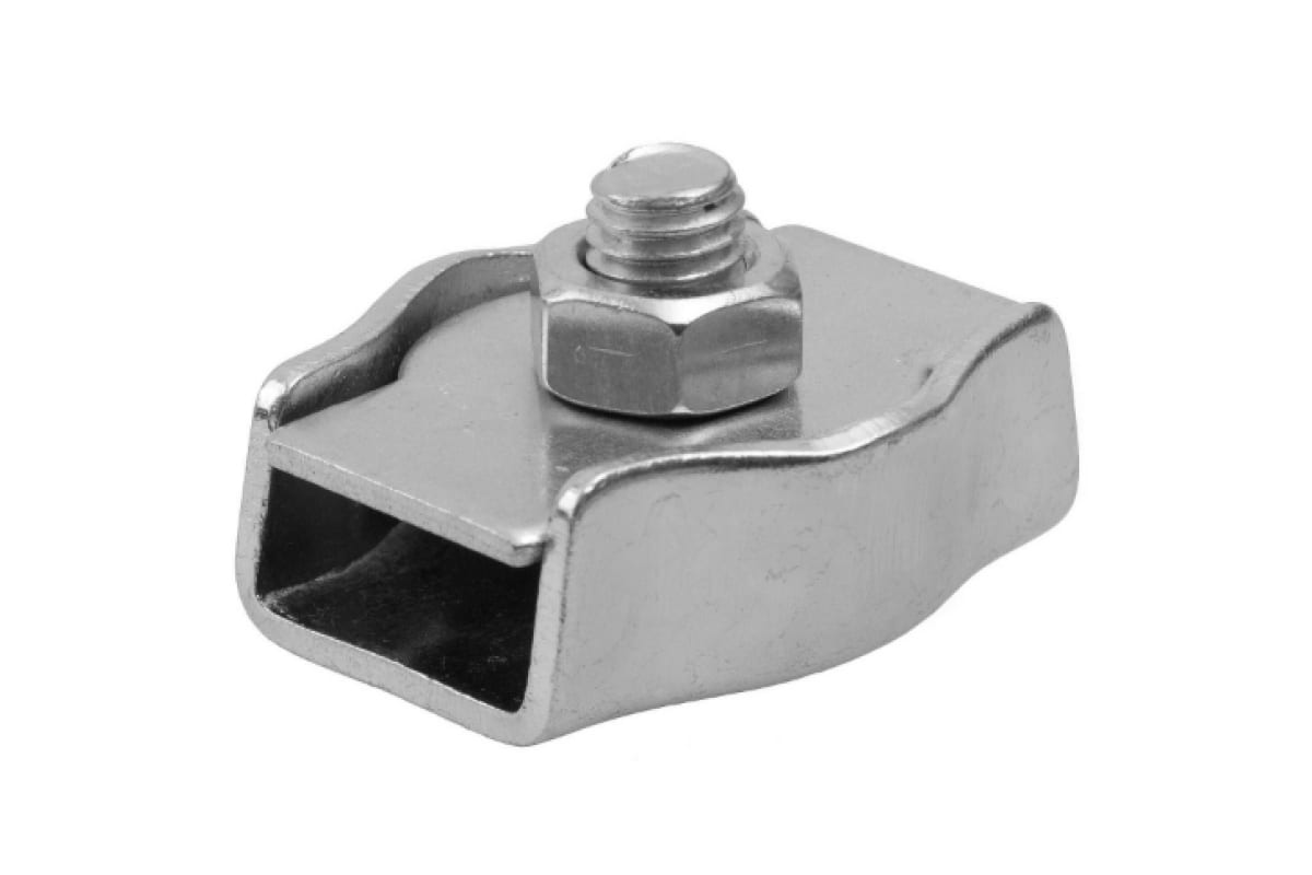 Зажим Зубр 4-304435-04 изготовлен из оцинкованной стали. Он необходим для формирования петель на концах троса. Свободный конец троса помещаем в зажим, а затем в полученную петлю закладываем коуш. После которого трос помещают с другой стороны винта. Необходимо, чтобы конец троса, помещаемый в зажим, выходил из него на расстояние не менее чем 1/2 диаметра троса. Сверху помещается прижимная пластина, и все соединение накрепко закручивается при помощи гаек.