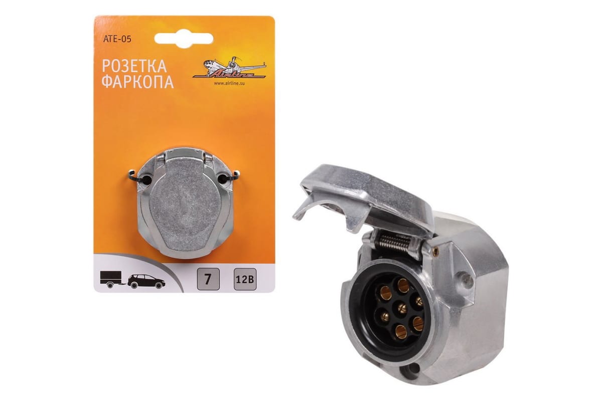 Розетка фаркопа Airline 7 контактов ATE-05 изготовлена из прочного алюминия. Благодаря электрическим латунным разъемам обеспечивают надежный контакт. Резиновые уплотнители предохраняют от влаги и грязи.