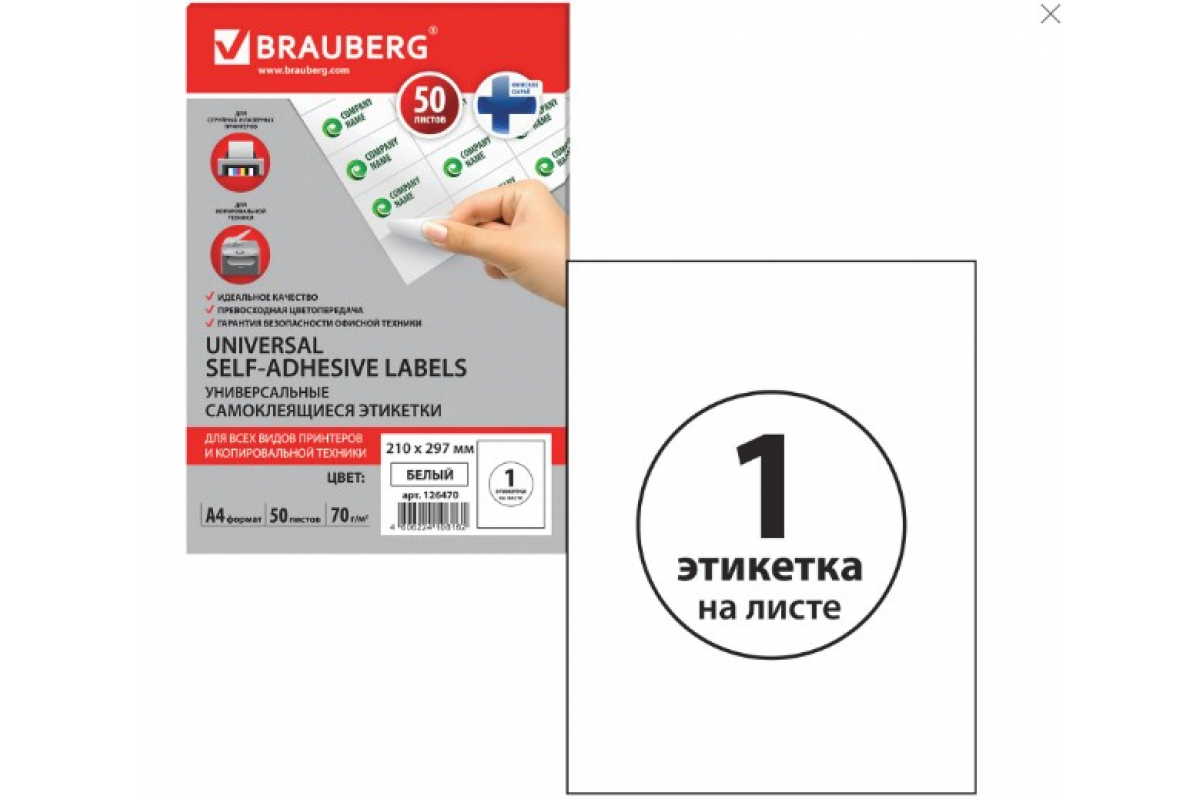 —Самоклеящаяся этикетка BRAUBERG 210х297 мм, 1 этикетка, 50 листов 126470