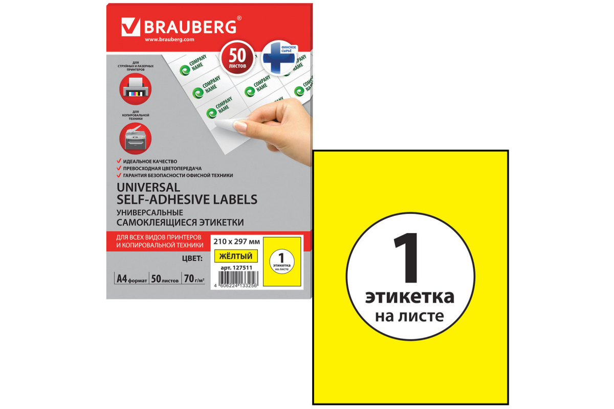 —Самоклеящаяся этикетка BRAUBERG 210х297 мм, 1 этикетка, 50 листов 127511—