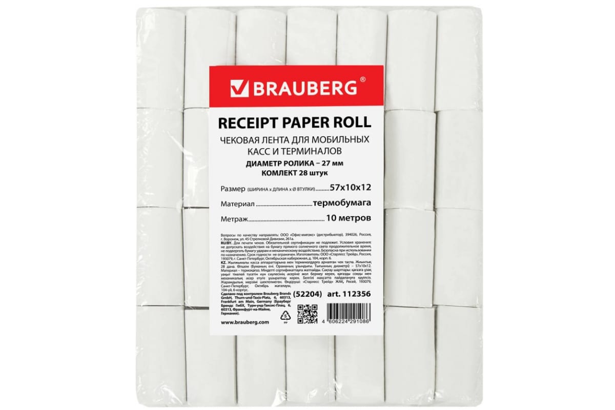 Чековая лента BRAUBERG ТЕРМОБУМАГА 57мм диаметр 27мм длина 10м втулка 12мм КОМПЛЕКТ 28шт 112356 имеет плотность бумаги: 44 г/м2. Подходит для для кассовых аппаратов, платежных терминалов самообслуживания, банкоматов и другого оборудования.