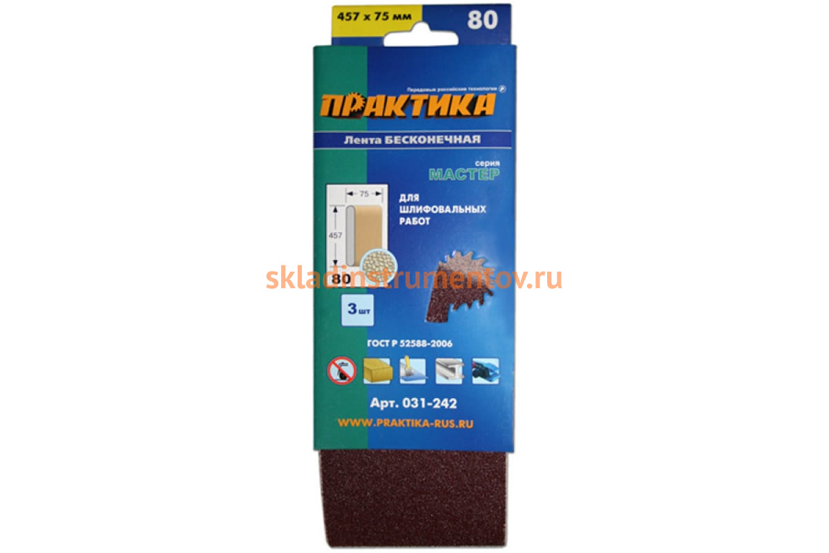 Лента шлифовальная (3 шт; 75х457 мм; P80) ПРАКТИКА 031-242