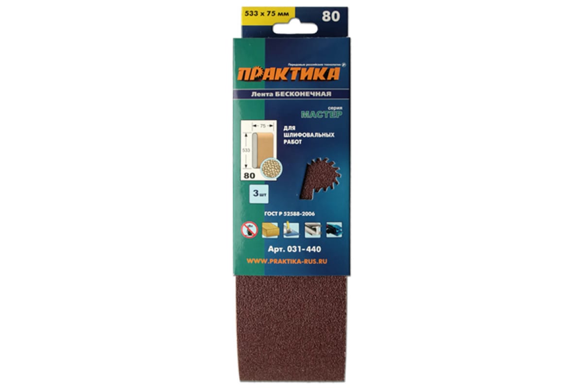 Лента шлифовальная (3 шт; 75х533 мм; P80) ПРАКТИКА 031-440