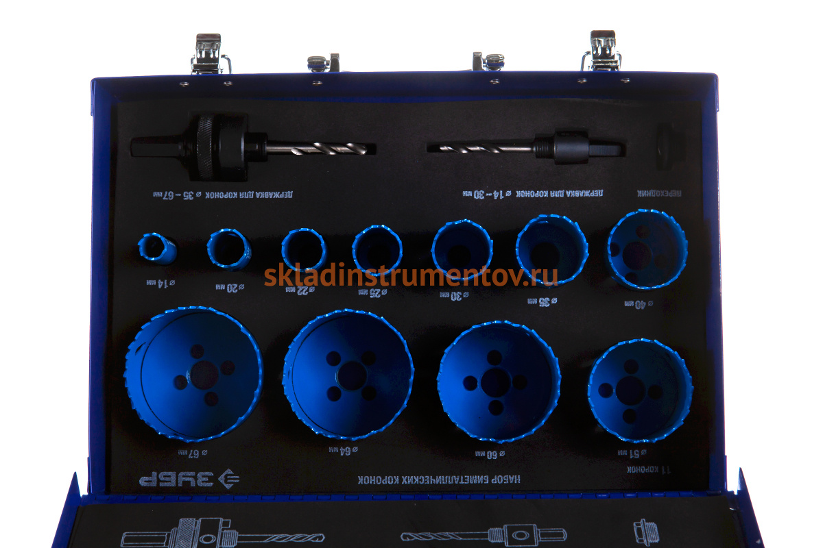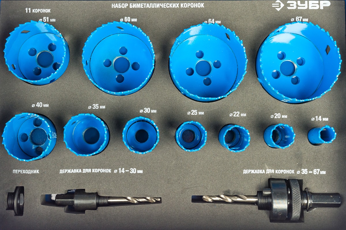 - 11 коронок диаметрами 14; 20; 22; 25; 30; 35; 40; 51; 60; 64; 67 мм;