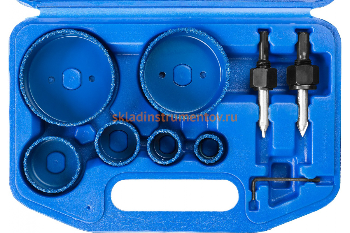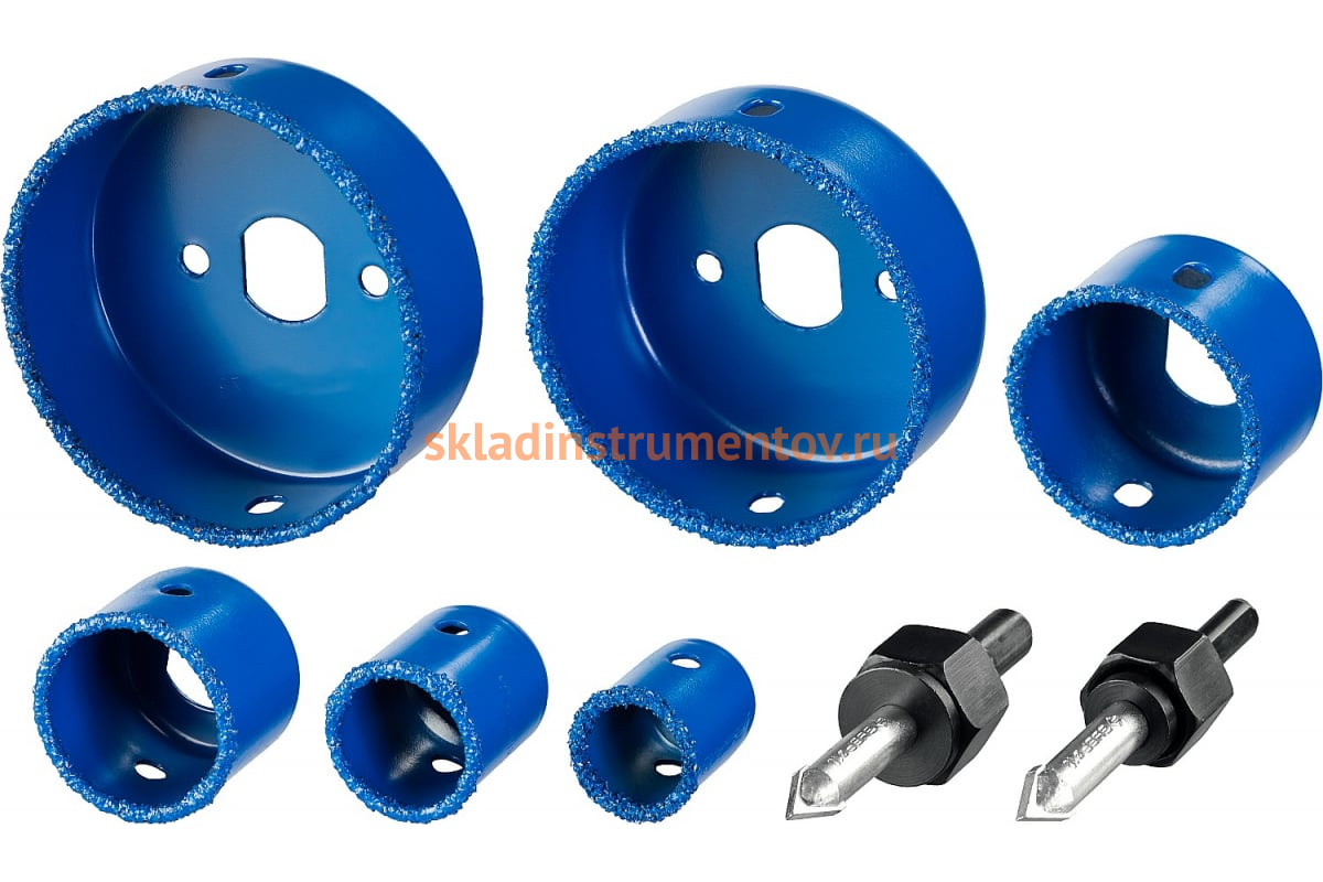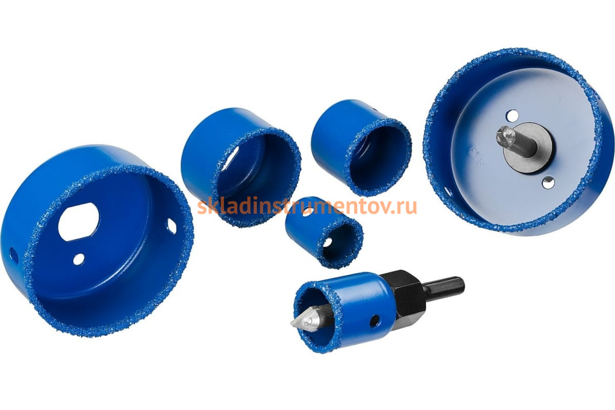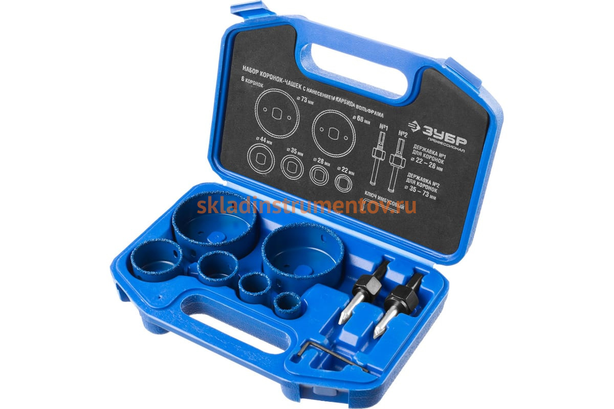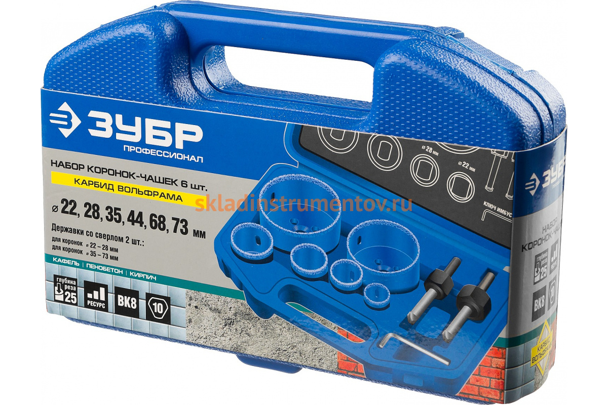 - 6 коронок-чашек высотой 25 мм диаметром: 22, 28, 35, 44, 68, 73 мм;