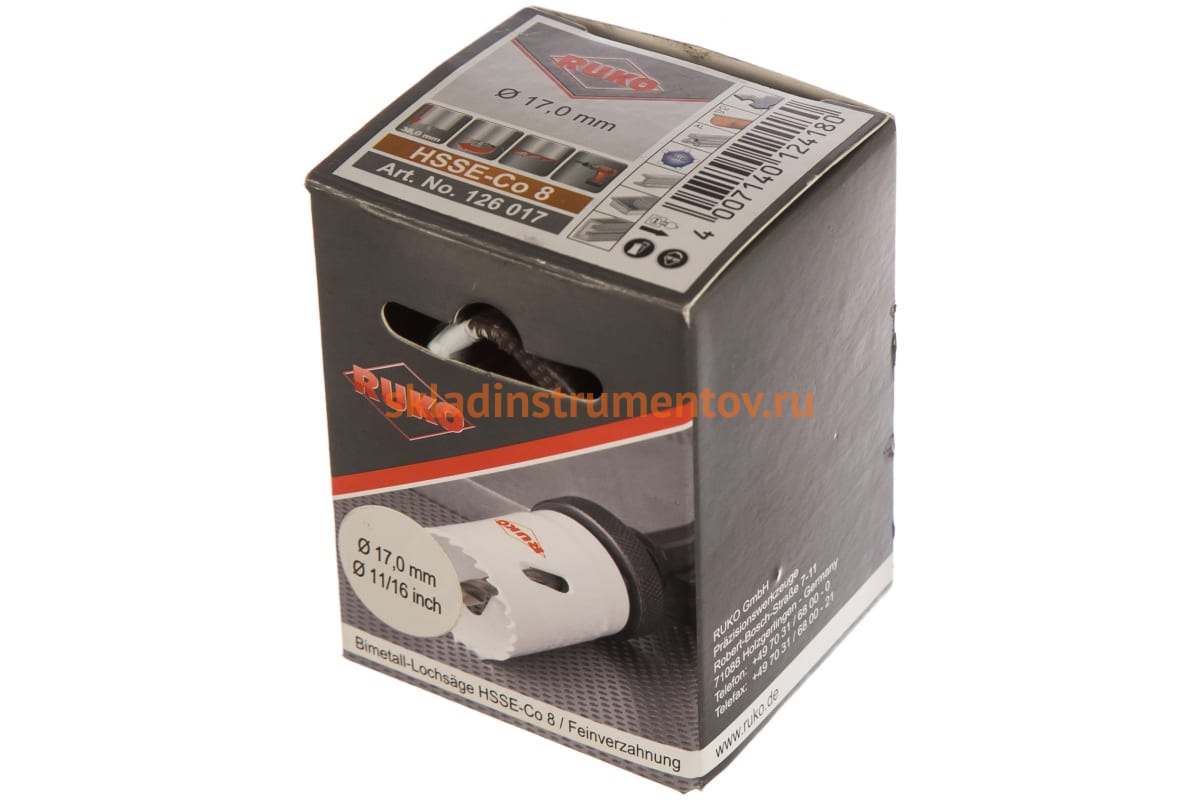 Биметаллическая коронка HSS Co 8% RUKO 126017 применяется с дрелями, легкими перфораторами и со стационарными станками в безударном режиме. Предназначена для сверления отверстий в черных и цветных металлах, пластике и прочих материалах. Корпус коронки изготовлен из углеродистой, а режущая часть из быстрорежущей стали с содержанием кобальта — 8%. Отверстия получаются точными и чистыми. Коронка используется в комплекте с хвостовиком. Хвостовик в комплект поставки не входит. При сверлении рекомендуется использовать СОЖ.