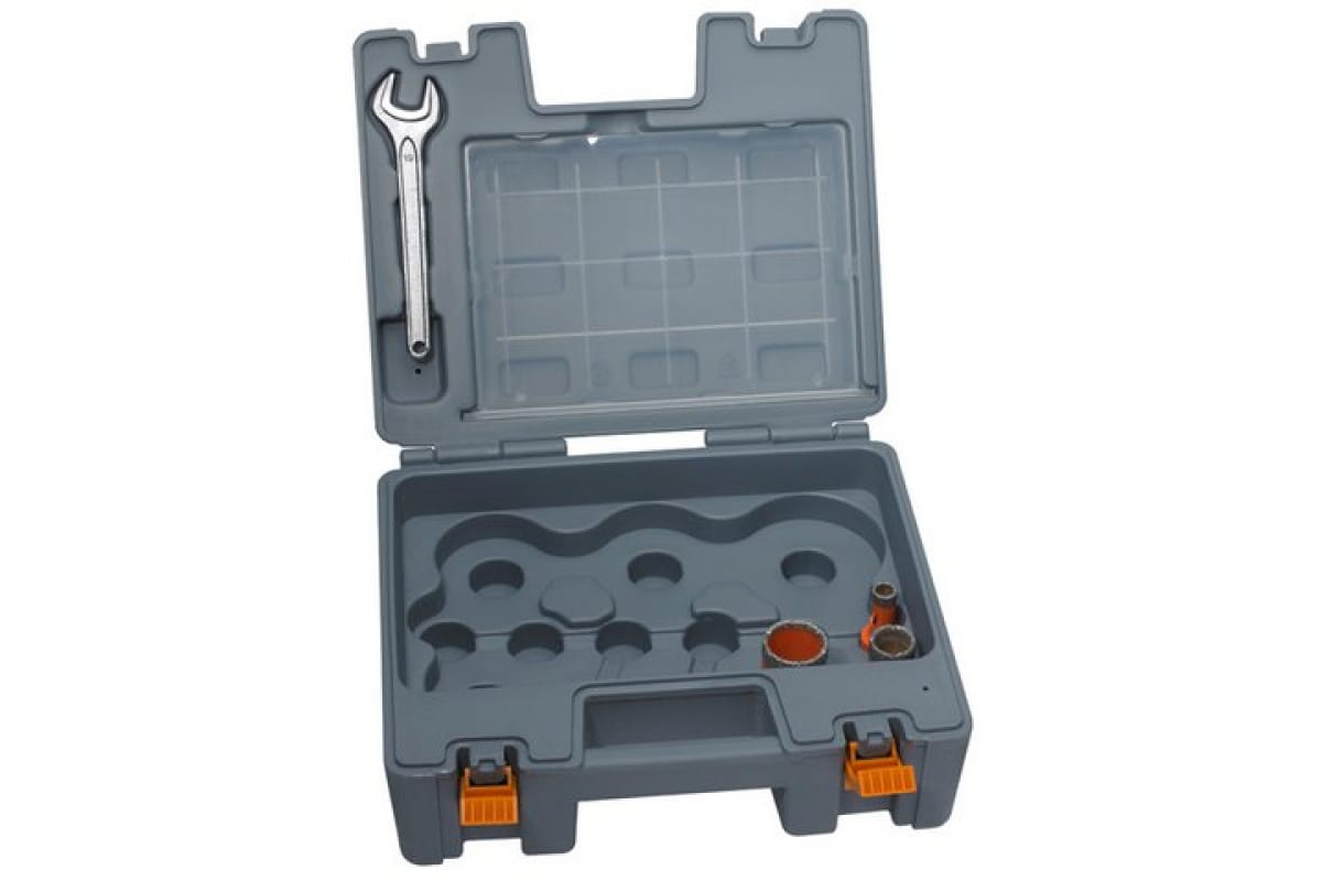 Набор алмазных коронок Speed Ceramics HAWERA F00Y265667 используется для сверления всех видов плитки, в том числе из керамогранита и натурального камня. Коронки применяются для сухого реза, без охлаждения. В набор с коронками входит кейс и ключ. Кейс имеет пустые ячейки для того, чтобы пользователь смог докупать и пополнять набор самостоятельно теми диаметрами, которые нужны именно ему.