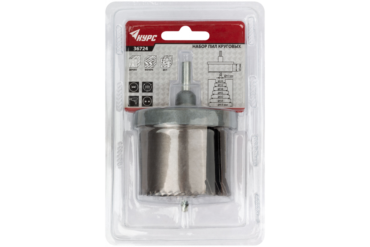 Пила круговая для дрели 26-32-38-45-50-56-63 мм глубина 50 мм 7 шт. КУРС 36724 предназначена для получения отверстий в деталях из фанеры, ДСП, мягких и твердых пород древесины.