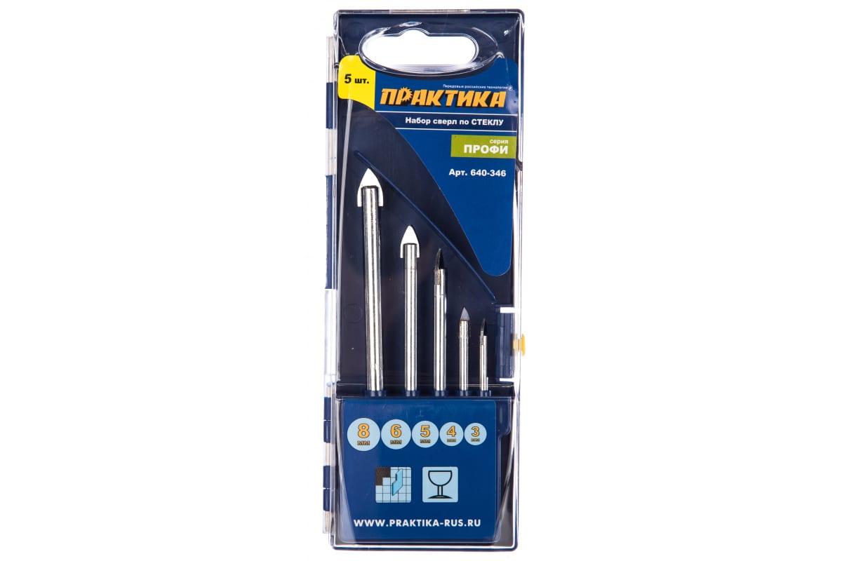 Набор сверл по стеклу и керамике Профи (5 шт; 3, 4, 5, 6, 8 мм) ПРАКТИКА 640-346