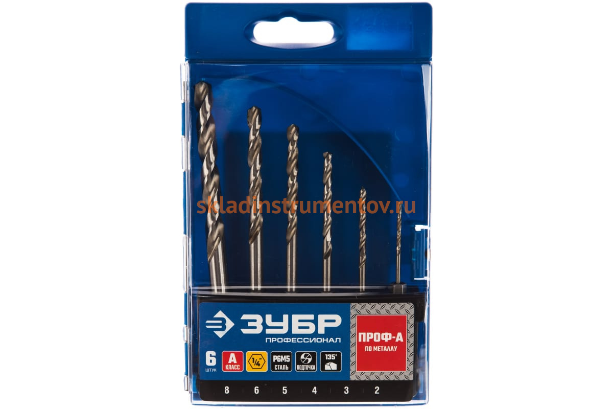 Набор сверл по металлу 6 шт d=2-8 мм, НЕХ 1/4" шестигранный хвостовик класс A сталь Р6М5, Пофессионал Зубр 29623-H6_z01