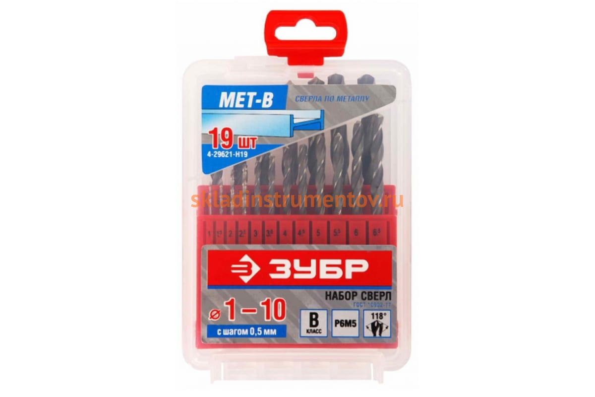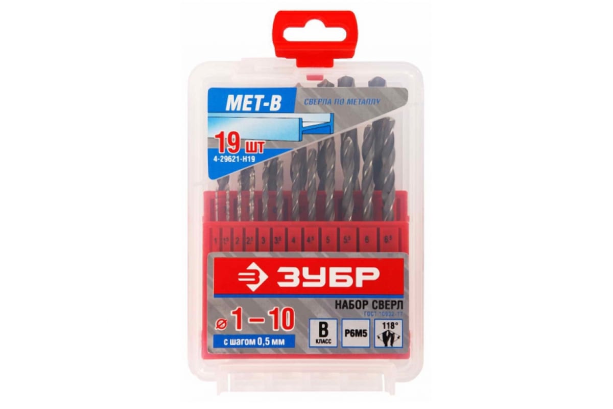 Набор сверл по металлу "МЕТ-В" Зубр 4-29621-H19 применяется совместно с дрелями для выполнения отверстий в деталях из легированной и конструкционной стали, цветных металлов и др. Сверла изготовлены из быстрорежущей стали Р6М5 в соответствии с требованиями ГОСТ 10902-77. Угол заточки при вершине сверла равен 118о . Сверла имеют класс точности В1 (нормальный). Это обеспечивает достаточное качество готового отверстия. Имеют цилиндрический хвостовик. Набор поставляется в пластиковом боксе.