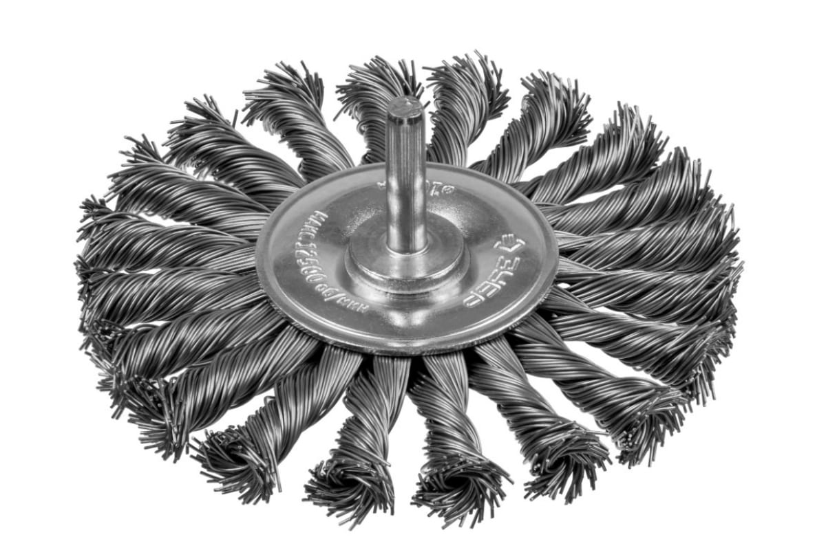 Щетка ЭКСПЕРТ дисковая для дрели (жгутированная стальная проволока 0,5 мм, 100 мм) Зубр 3522-100_z01 используется для удаления старого ЛКП, зачистки от ржавчины и окалины металлических поверхностей.