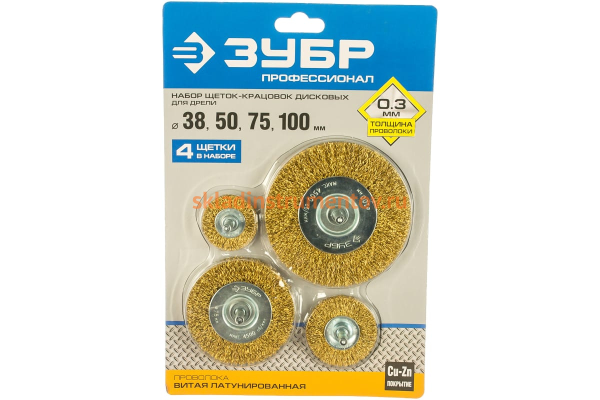 Набор щеток дисковых для дрели, проволока 0.3 мм, 4 шт. Зубр 3521-H4_z03 используется с дрелью для зачистки от ржавчины и окалины металлических поверхностей.