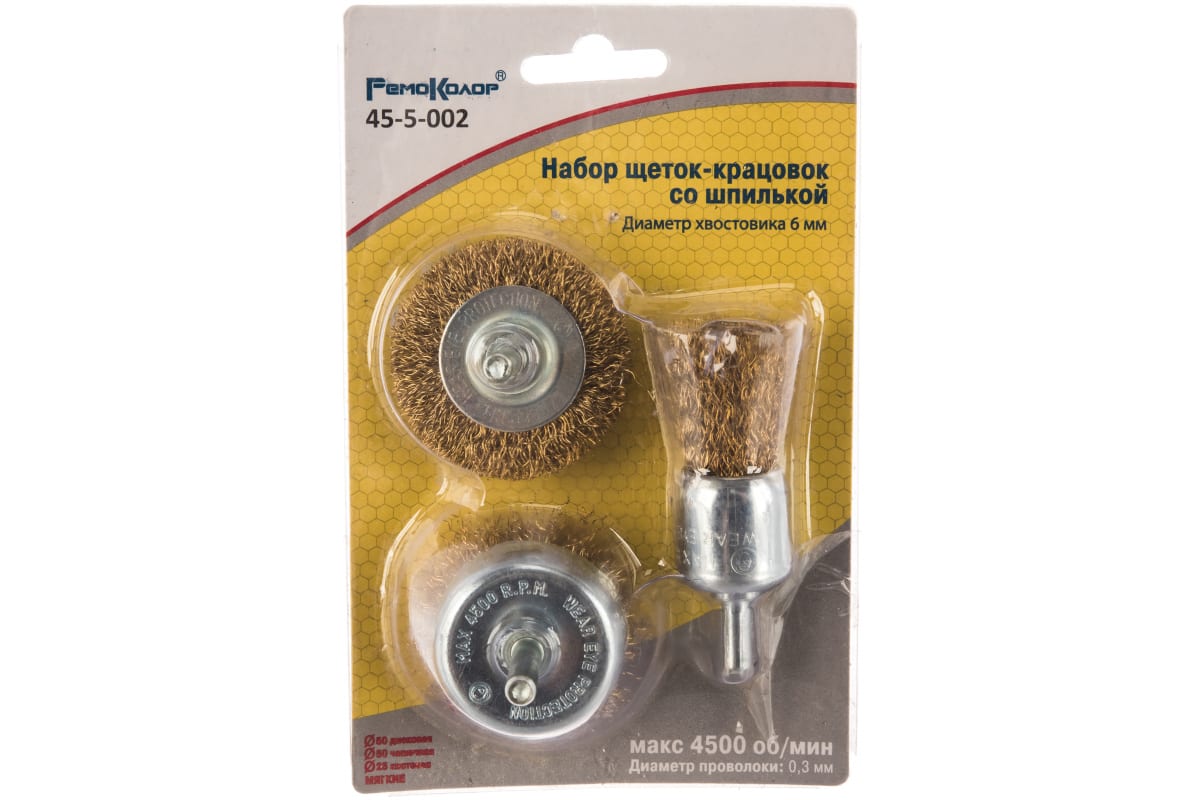 Набор щеток-крацовок со шпилькой для дрели РемоКолор 45-5-002 применяется для первичной обработки деревянных и металлических поверхностей, снятия краски, ржавчины, шлифовки металла, обработке сварных швов.
