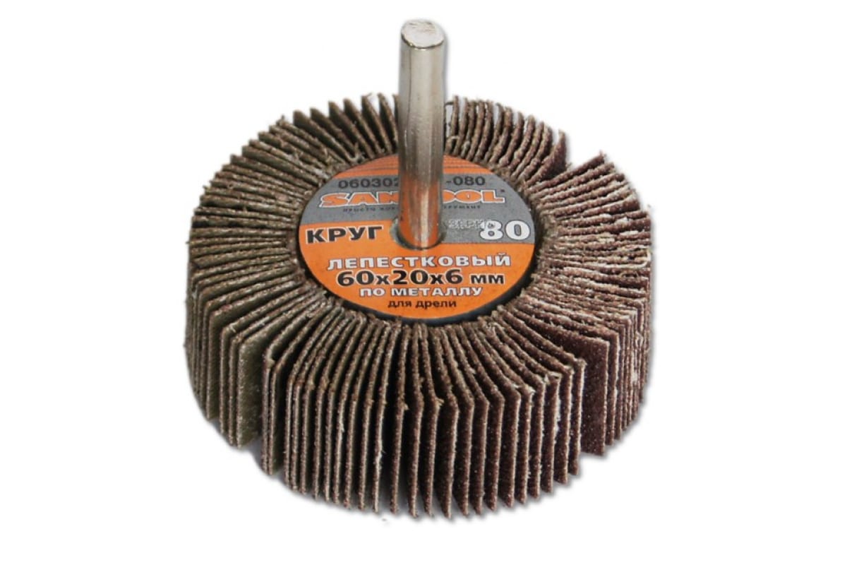 Круг лепестковый SANTOOL 060302-001-080 устанавливается в патрон дрели, используется для шлифования, обработки внутренних поверхностей, сварных швов и других подобных операций по металлу.