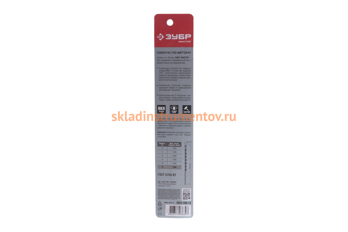 Сверло Зубр 2922-200-12 серии "Мастер" используется совместно с дрелями для ударного сверления конструкций из бетона, кирпича, камня, плотных известняков. На наконечник сверла напаяна твердосплавная пластина марки ВК8, что позволяет существенно повысить скорость обработки и рабочий ресурс сверла. П-образная форма спирали обеспечивает эффективное и быстрое удаление отходов сверления из отверстия. Угол заточки при вершине 130 о. Сверло имеет цилиндрический хвостовик. Изготовлено из высокопрочной стали, обладает хорошей износостойкостью.