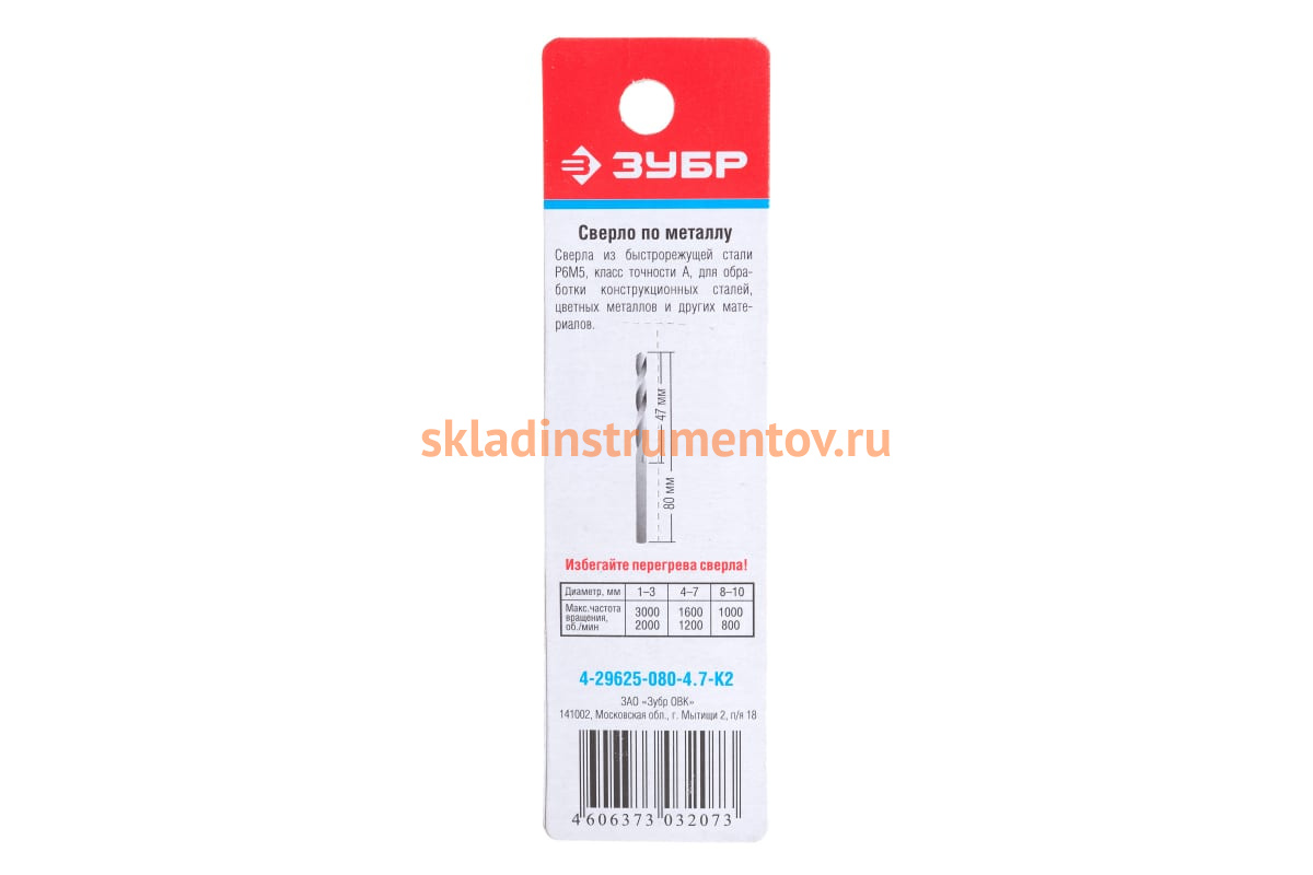 Сверло Зубр 4-29625-080-4.7-K2 «ЭКСПЕРТ» предназначено для выполнения сквозных и глухих отверстий в металлических заготовках из легированной и углеродистой стали с пределом прочности при растяжении до 900 Н/мм2, цветных металлах и других материалах. Сверло изготовлено из высокопроизводительной быстрорежущей стали Р6М5. Угол режущей части 135 градусов, в сочетании с крестообразной подточкой перемычки позволяет работать без предварительного кернения заготовки и обеспечивает высокое качество обработки, а также максимальную производительность. Оснастка имеет цилиндрический хвостовик. Работает в правом направлении. Класс точности сверла А1. Изготовлено в соответствии с требованиями ГОСТ 10902-77.