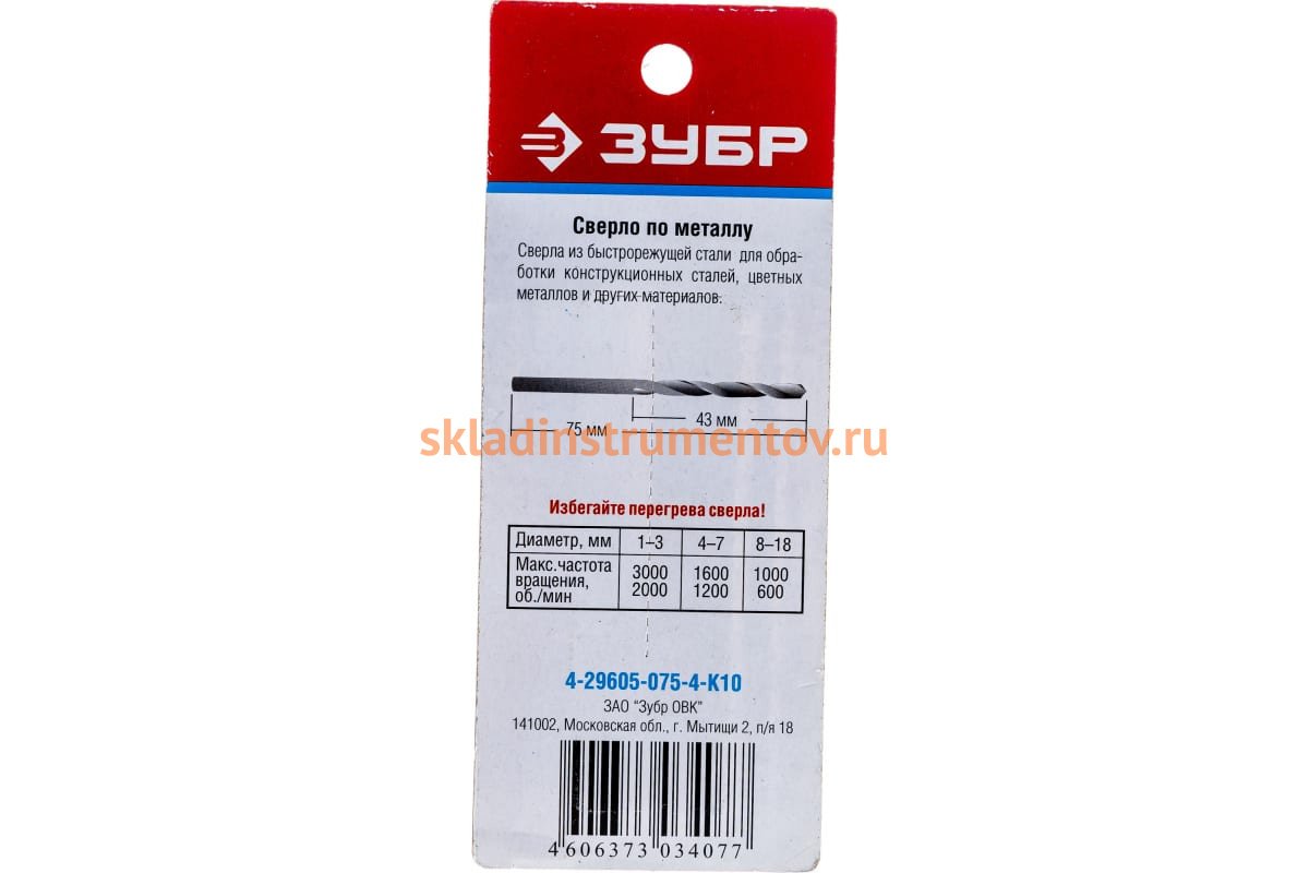 Сверло Зубр 4-29605-075-4-K10 «ТЕХНИК» предназначено для выполнения сквозных и глухих отверстий в металлических заготовках из легированной и углеродистой стали с пределом прочности при растяжении до 800 Н/мм2, цветных металлах и других материалах. Сверло изготовлено из высокопроизводительной, быстрорежущей стали Р4М2 с парооксидальным покрытием. Угол режущей части 118 градусов. Оснастка имеет цилиндрический хвостовик. Работает в правом направлении. Класс точности сверла В1. Изготовлено в соответствии с требованиями ГОСТ 10902-77.