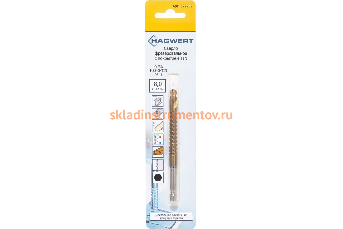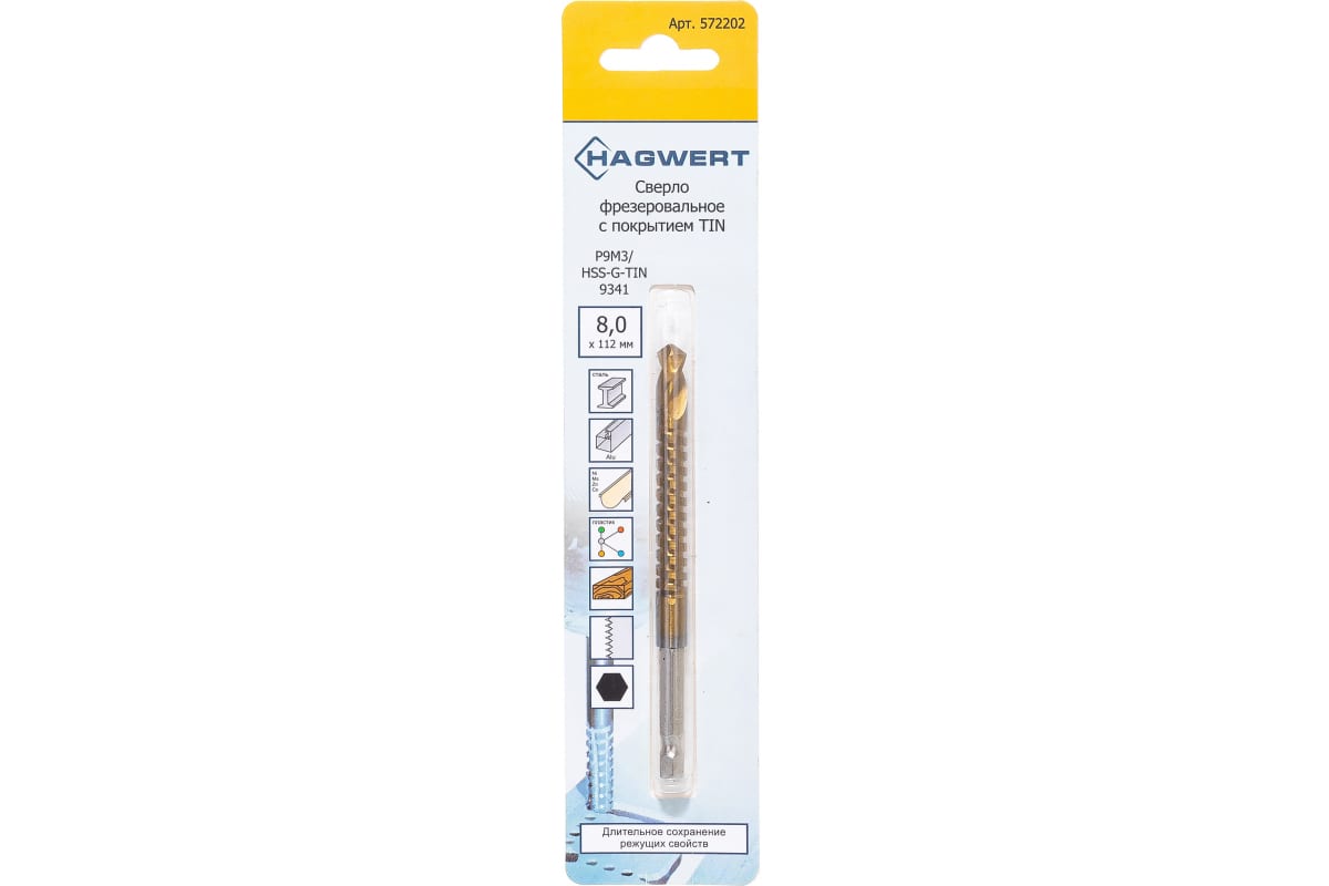Сверло-фреза универсальное HAGWERT 572202 предназначено для сверления отверстий в листовых материалах из металла, пластмассы, древесины, фанеры. Изготовлено из быстрорежущей стали P6M5/HSS-TIN и имеет титановое напыление, что обеспечивает повышенную стойкость режущих кромок.