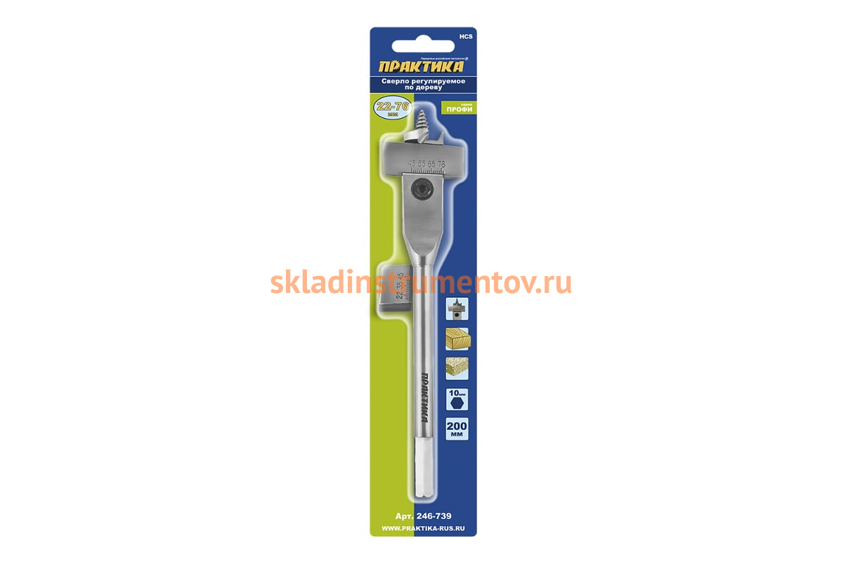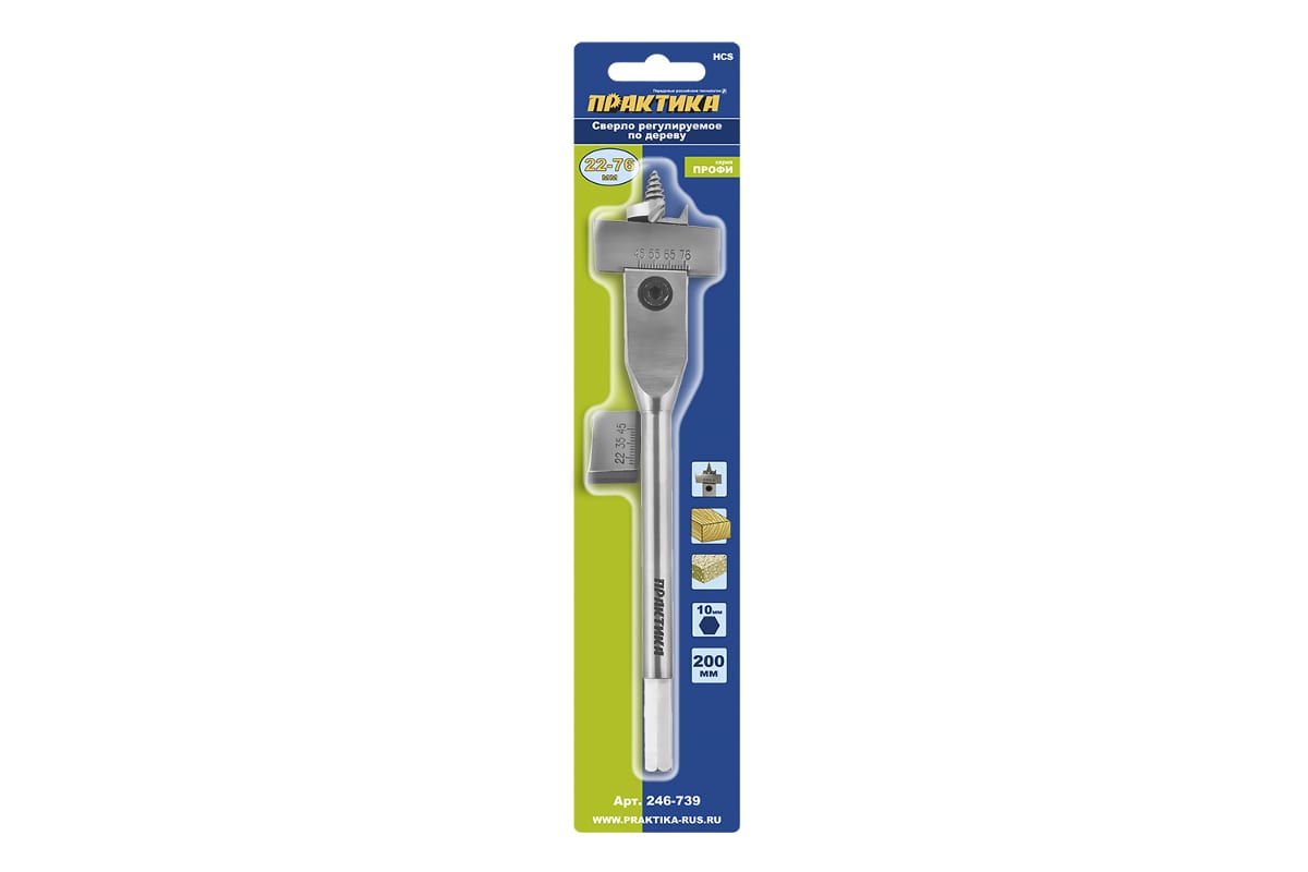 Сверло по дереву ПРАКТИКА 246-739 предназначено для получения отверстий диаметром от 22 до 76 мм в изделиях из древесины. Изготовлено из высокоулеродистой стали. Имеет возможность регулировки рабочей части с помощью ключа, входящего в комплект. Шестигранный тип хвостовика обеспечивает быструю и простую установку оснастки в патрон, а также исключает ее проскальзывание.