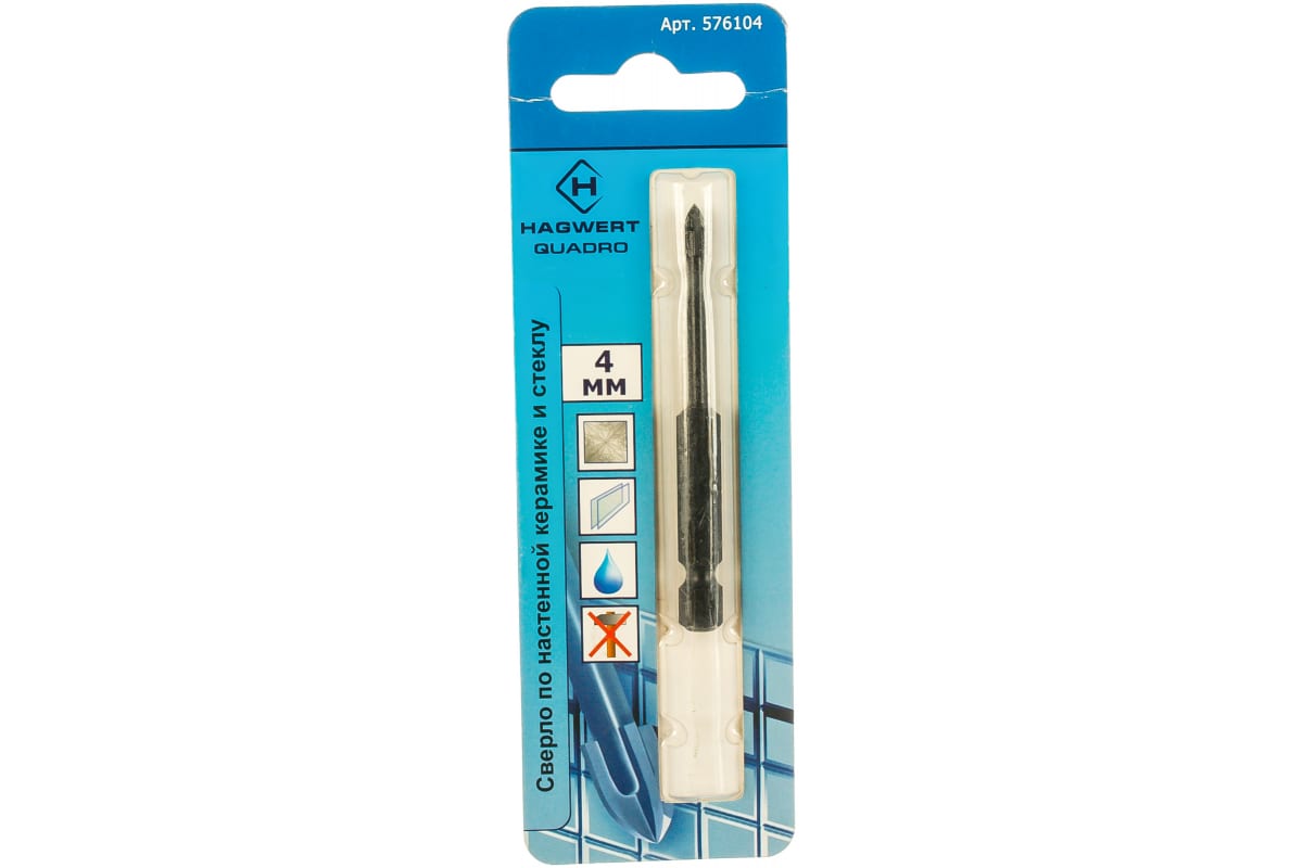 Сверло Quadro HAGWERT 576104 применяется для сверления отверстий в керамической плитке 1-4 класса твёрдости, керамограните, стекле. Твердосплавная напайка изготовлена из карбид-вольфрамового сплава. Количество граней — 4. Сверление следует проводить на низких скоростях с достаточным охлаждением сверла и места сверления.