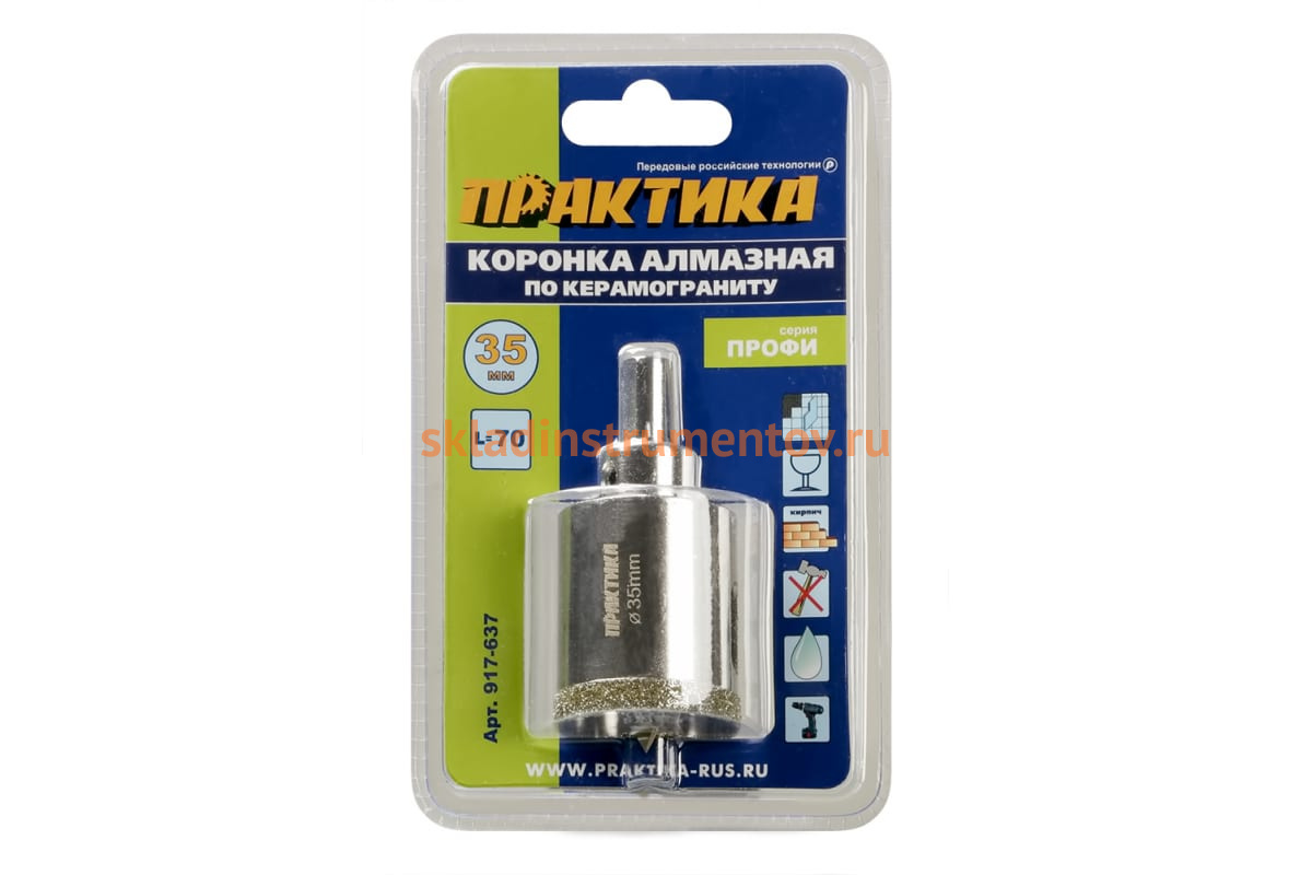 Коронка алмазная ПРАКТИКА 917-637 предназначена для дрелей. Применяется для сверления отверстий в керамограните, керамической плитке и изделиях из керамики. Ограниченно подходит для сверления толстого стекла. Работать коронкой необходимо в безударном режиме сверления и с охлаждением водой. Рекомендуется ограничивать скорость подачи и частоту оборотов во избежание перегрева коронки. Оснастка комплектуется центрирующим сверлом.