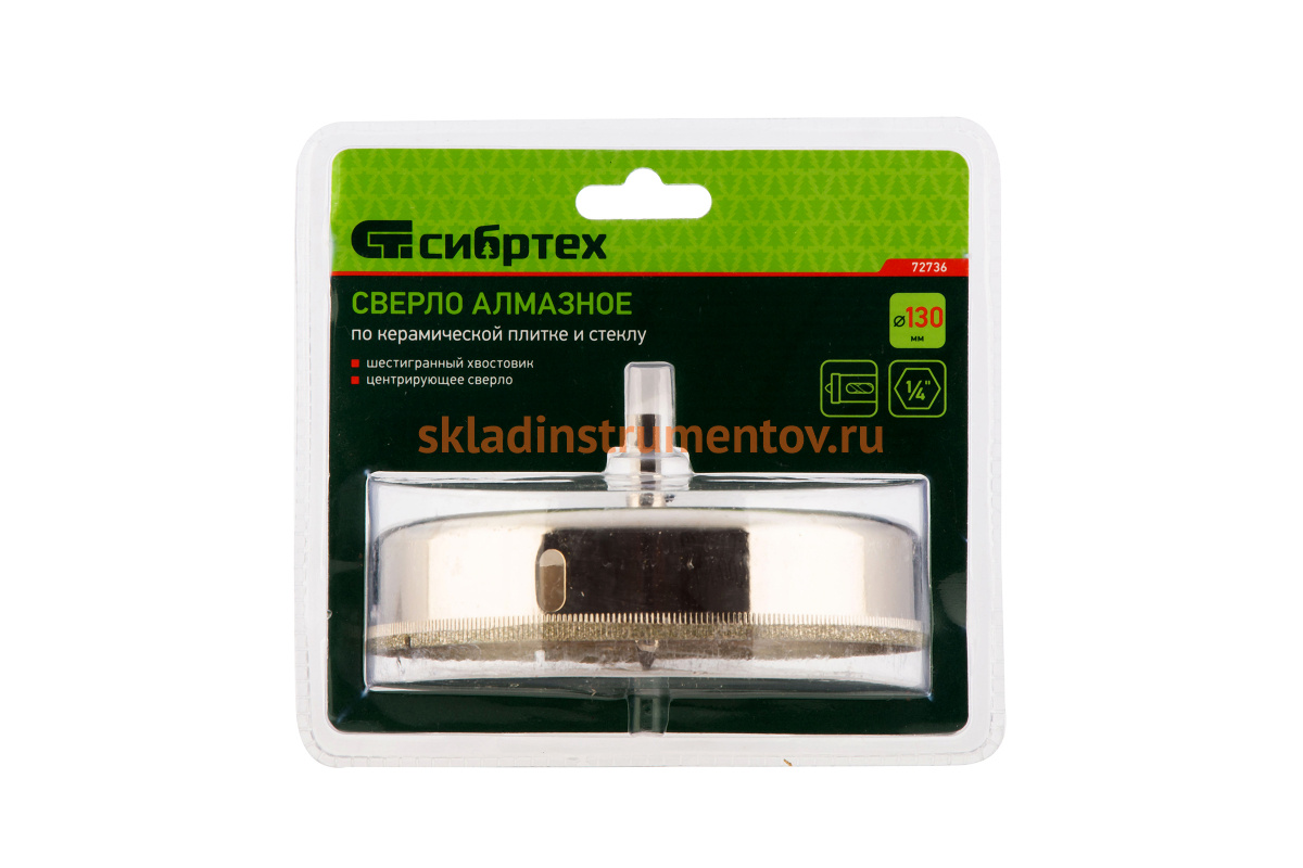 Сверло СИБРТЕХ 72736 предназначено для сверления отверстий в керамической плитке и стекле с применением водяного охлаждения.