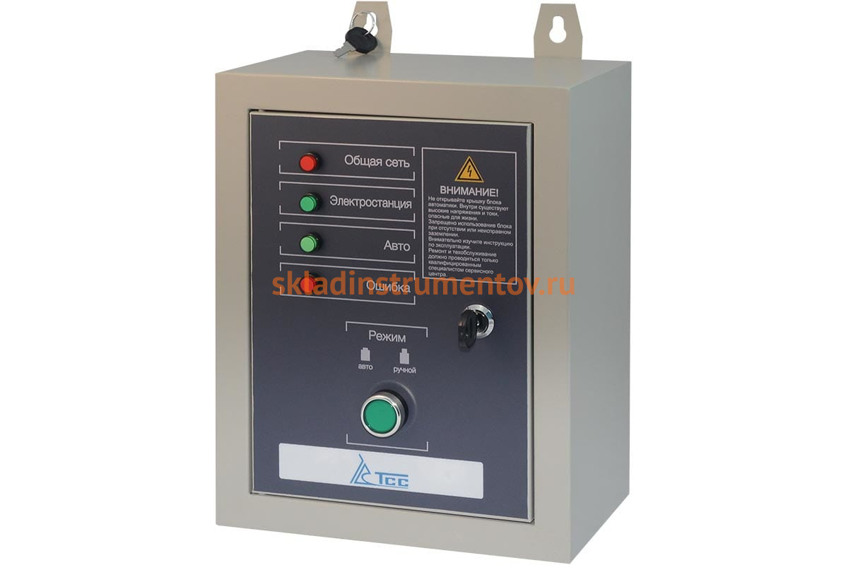 Блок АВР 5-8 кВт/230 ТСС 189998 предназначен для автоматического запуска бензинового генератора в момент падения основного источника электроэнергии и переключения нагрузки без вмешательства человека. При появлении основного источника электропитания происходит отключение электростанции. В режиме ожидания станция осуществляет постоянную подзарядку бортового аккумулятора от сети. Комплектуется кабелем для подключения к электростанции.