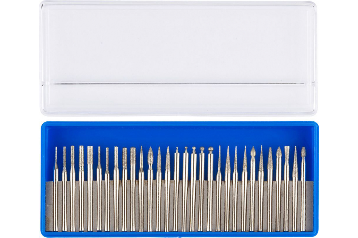 —Набор мини-насадок Зубр с алмазным напылением в пластиковом боксе P 180 хвостовик диаметр 3 мм 30 предметов 33383-H30—
