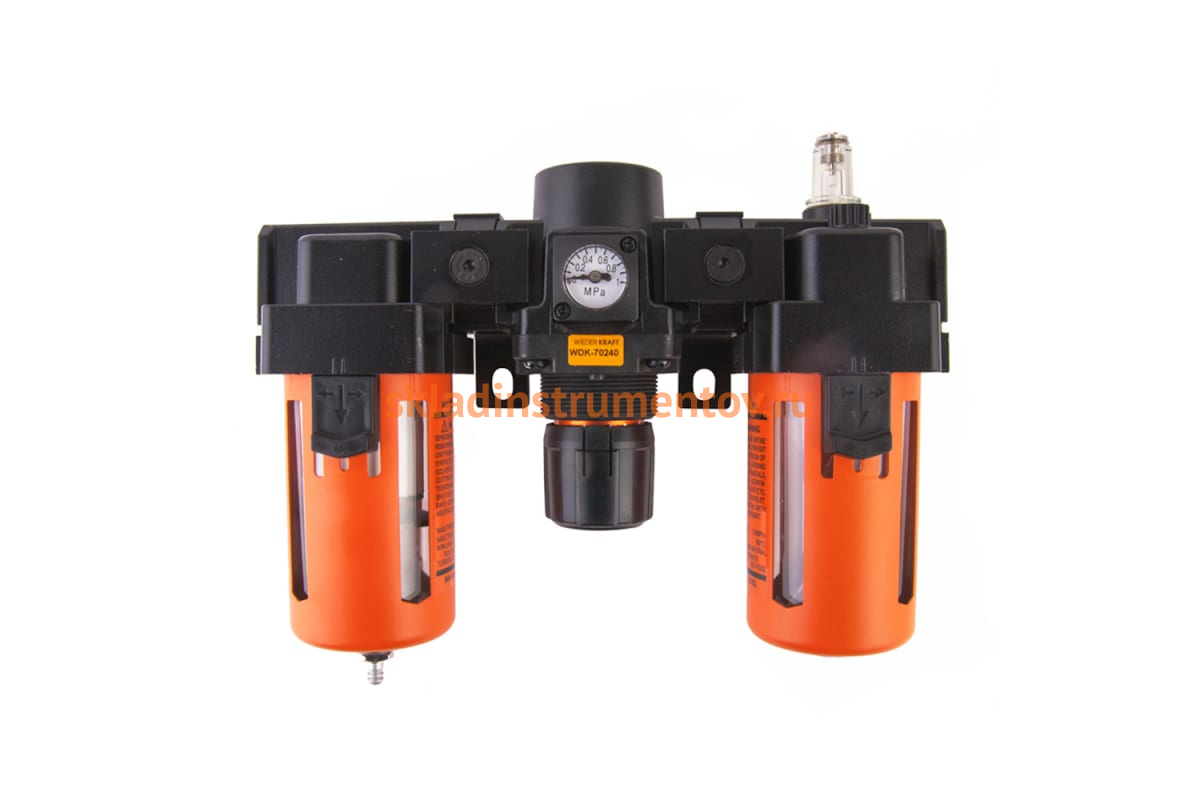 Блок подготовки воздуха WIEDERKRAFT WDK-70240 используется совместно с компрессорным оборудованием и пневмоинтрументом. Фильтр-влагоотделитель применяется для очистки сжатого воздуха от механических частиц, воды. Лубрикатор предназначен для подачи смазывающих материалов и поддержания постоянной концентрации воздух-масло. Имеет возможность регулировки подачи масла. Регулятор давления применяется для контроля и фиксации давления в пневмосистеме. Уровень давления регулируется с помощью вентиля и отображается на встроенном манометре.