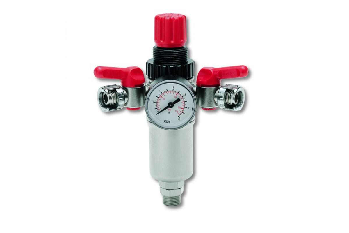 Регулятор давления RPF-187 3/8 GAV 13031 предназначен для контроля давления в пневмосистеме. Также выполняет функцию фильтра: очищает сжатый воздух от воды, масла и пыли. Подключается к магистрали с помощью байонетного соединения. Уровень давления регулируется с помощью вентиля и отображается на встроенном манометре.