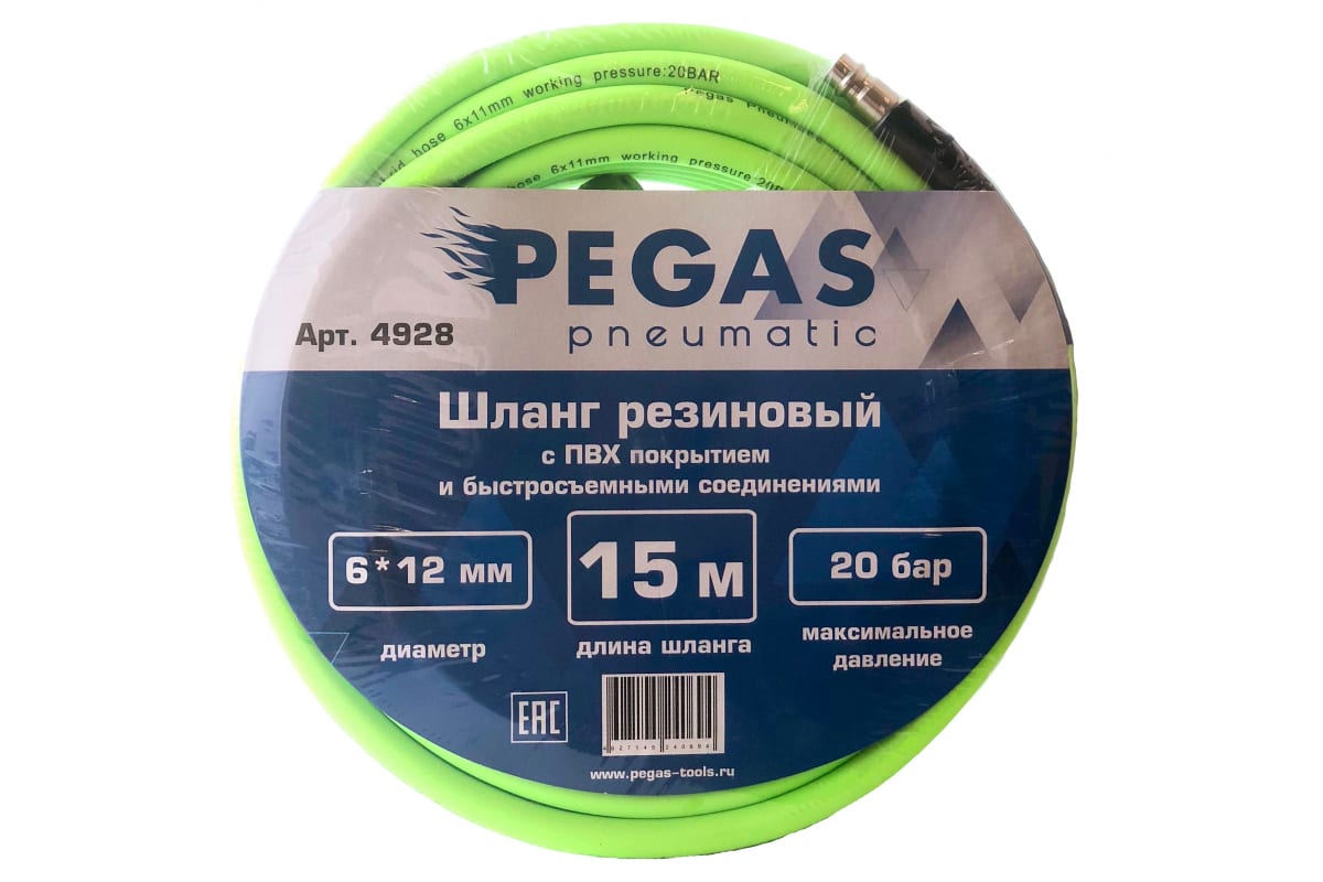 —Шланг резиновый профессиональный с быстросъемными соединениями и пвх покрытием (15 м; 6х12 мм; 20 бар) Pegas 4928—