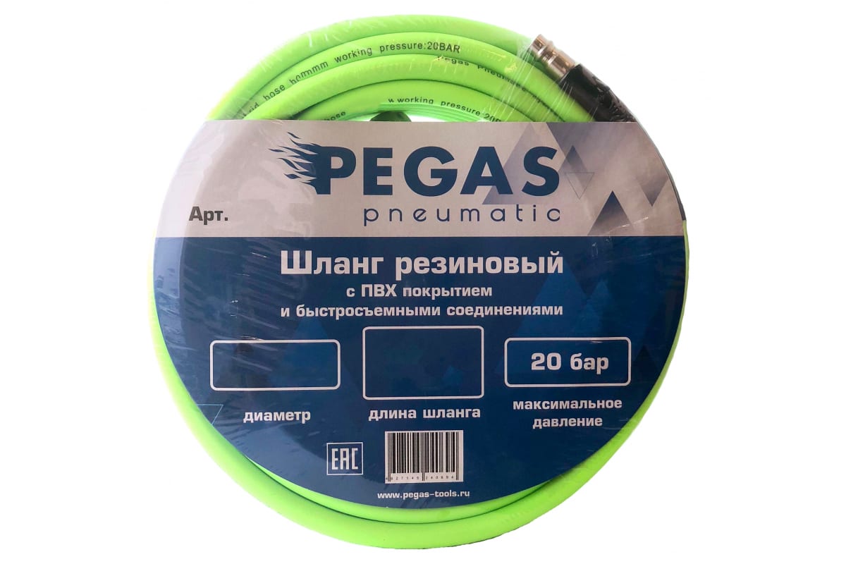 —Шланг резиновый профессиональный с быстросъемными соединениями и пвх покрытием (10 м; 6х12 мм; 20 бар) Pegas pneumatic 4927—