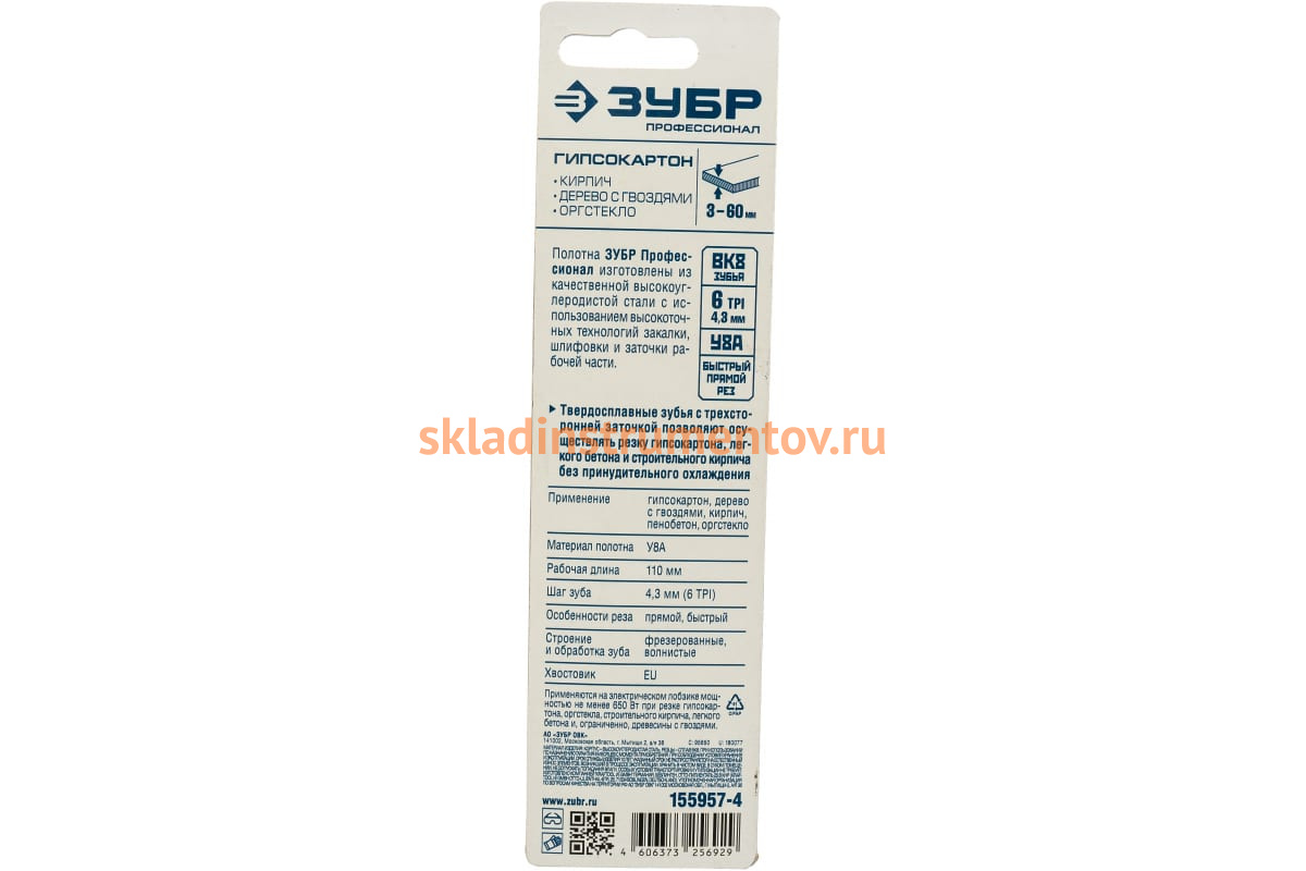 Полотна Зубр 155957-4 серии Профессионал используются с электролобзиками мощностью не менее 650 Вт. Применяются для резки кирпича, газосиликата и древесины с гвоздями. Полотно имеет увеличенную толщину, что улучшает устойчивость к излому и перегибу. Оснастка имеет Т-хвостовик. Изготовлено из высокоуглеродистой стали с твердосплавными зубьями, что увеличивает рабочий ресурс и стойкость к нагрузкам.