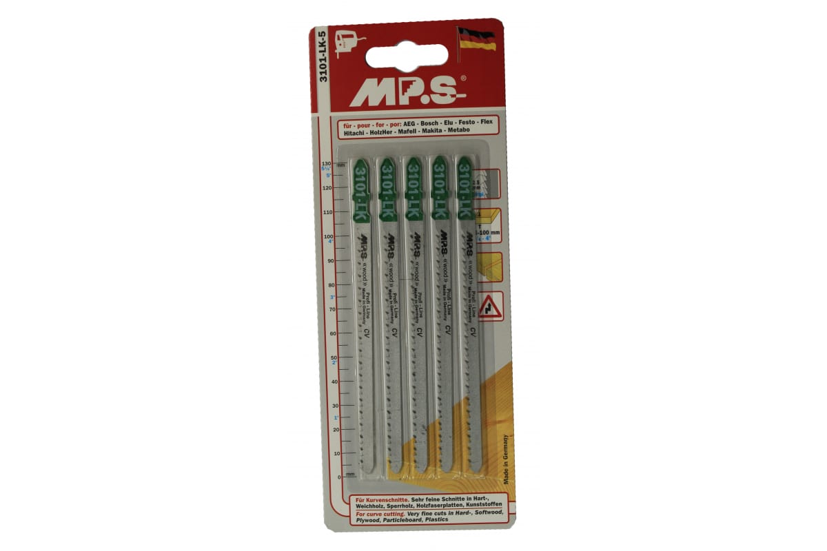 Пилки MPS 3101-LK используются для фигурных пропилов в твердой и мягкой древесине, фанере, ламинированном ДСП, ДВП и пластмассе толщиной 6-100 мм с помощью электролобзика. Выполнены из качественных материалов, имеют длительный срок эксплуатации.