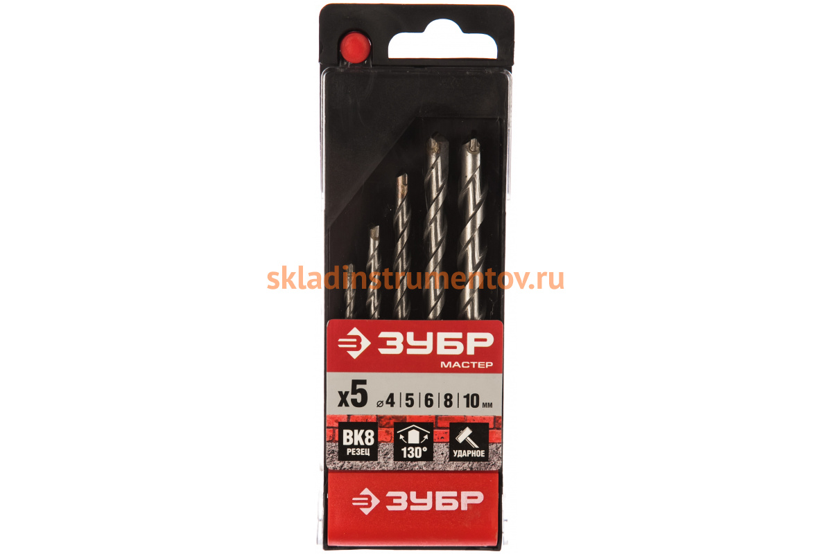 Набор ЗУБР 2922-H5 включает в себя 5 сверл размером 4; 5; 6; 8; 10 мм. Он предназначен для ударного сверления бетона, кирпича и камня. Оснастка изготовлена из инструментальной стали ВК8. У сверл угол заточки при вершине 130° и П-образная спираль. Этот набор подойдёт не только для простых бытовых работ, но и для различных случаев профессиональным строителям.
