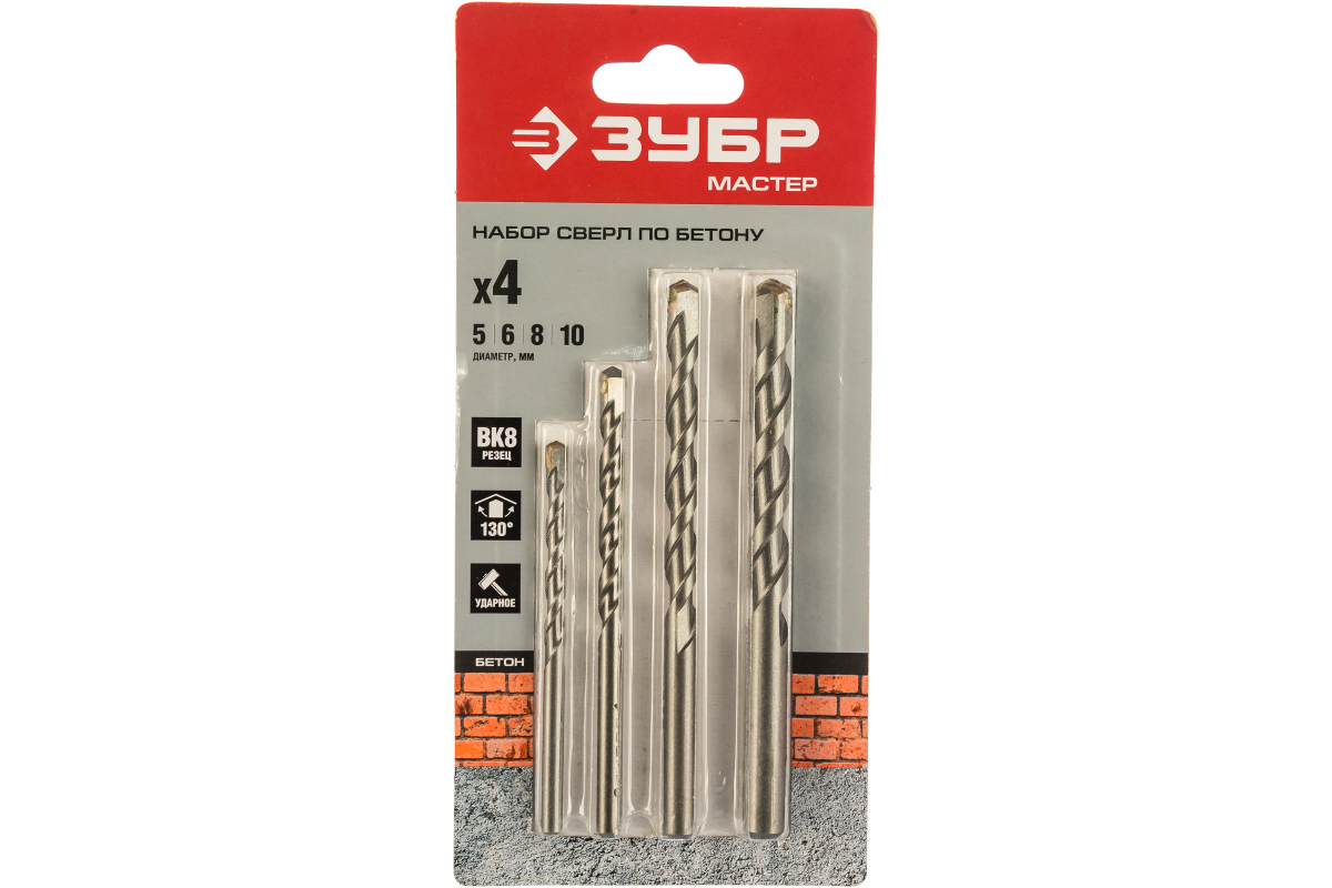 Набор ЗУБР 2922-H4 включает в себя 4 сверла размерами 5; 6; 8; 10 мм. Он предназначен для ударного сверления бетона, кирпича и камня. Оснастка изготовлена из инструментальной стали ВК8. У сверл угол заточки при вершине 130° и П-образная спираль. Этот набор подойдёт не только для простых бытовых работ, но и для различных случаев профессиональным строителям.