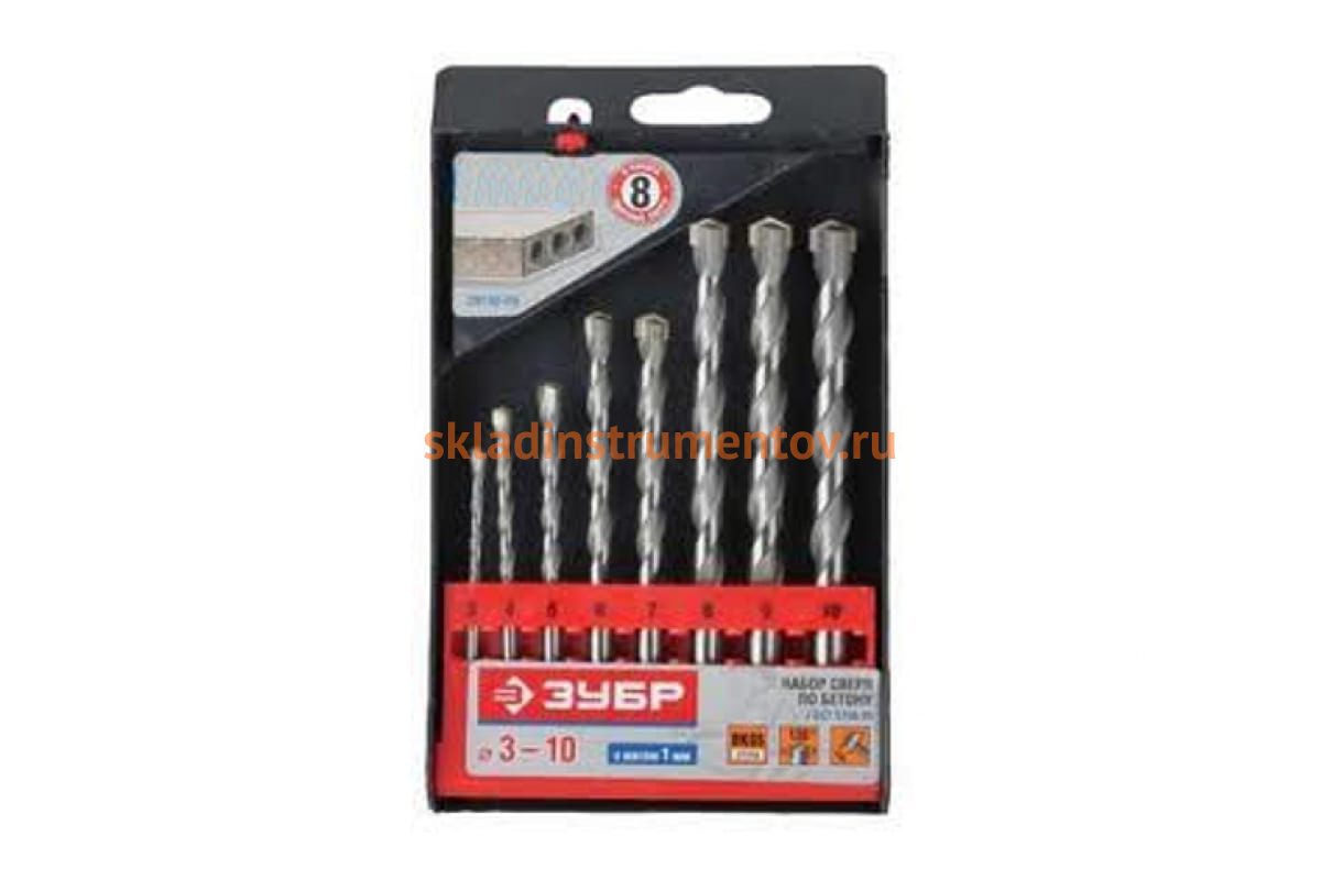 В наборе 8 сверл диаметрами 3, 4, 5, 6, 7, 8, 9, 10 мм в пластиковом боксе.