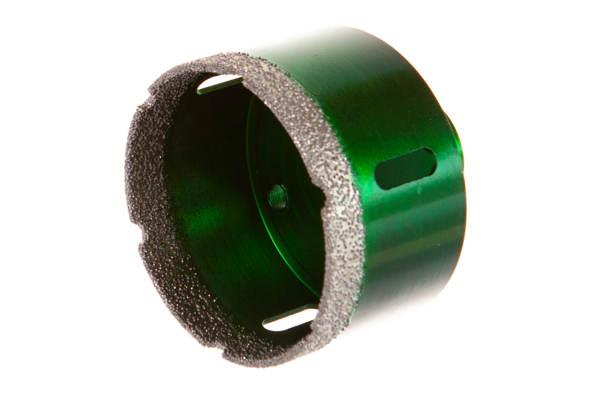 В конструкции коронки предусмотрены боковые отверстия, которые охлаждают оснастку и способствуют быстрому удалению керна после сверления. Алмазный элемент крепится к телу коронки при помощи вакуумной пайки.