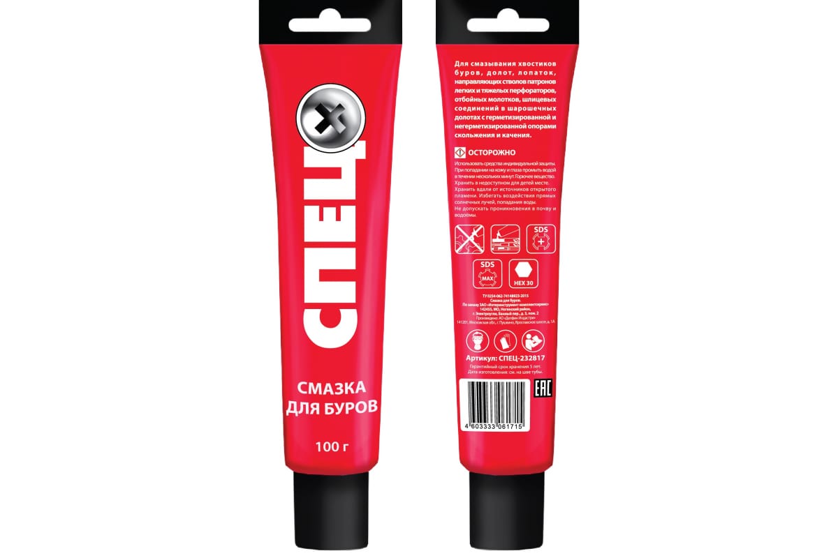 Смазка для хвостовиков буров, долот, лопаток, туба 100 гр Спец СПЕЦ-232817 — смесь, предназначенная для обработки хвостовиков насадок, которые устанавливаются в патроны перфораторов и дрелей. Подходит для любого инструмента стандарта SDS. Материал дополнительно защищает посадочное гнездо от пыли, выделяемой в процессе сверления или долбления.