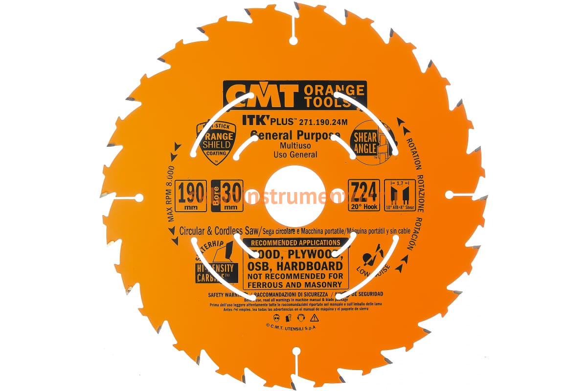 Пильный диск CMT 271.190.24M изготовлен из высококачественной стали и затем закален до значения 44 по шкале твердости Роквелла. Он используется совместно с ручными циркулярными, торцовочными и аккумуляторными пилами. Зубья оснастки выполнены из твердого сплава и имеют специальную форму, благодаря которой снижается нагрузка на пилу и увеличивается скорость пиления. Специальные лазерные прорези на диске способствуют снижению шума и биения, которые вызываются вибрацией пилы во время работы. Антипригарное защитное покрытие пильного диска снижает его перегрев, уменьшает количество налипаемой грязи и защищает от коррозии. Подходит для продольного и поперечного пиления древесины любого вида. Пропил получается очень тонким. В комплект пильного диска с посадочным диаметром 30 мм входят переходные кольца с посадочными диаметрами 16 мм и 20 мм.