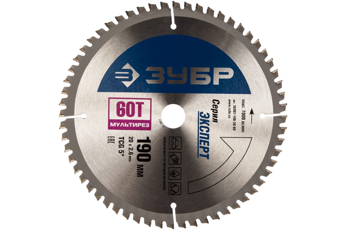 Пильный диск Зубр 36907-190-20-60 предназначен для продольного и поперечного распила алюминия, ламината, пластика, ДСП с покрытием и твердых пластмасс. Трапециевидные переменные зубья типа TCG с отрицательным углом (-5°) позволяют делать очень точный рез. Правильная геометрия зубьев поддерживается автоматически в процессе работы. На зубья напаяны твердосплавные карбидвольфрамовые пластины ВК8, которые значительно продлевают ресурс работы диска.