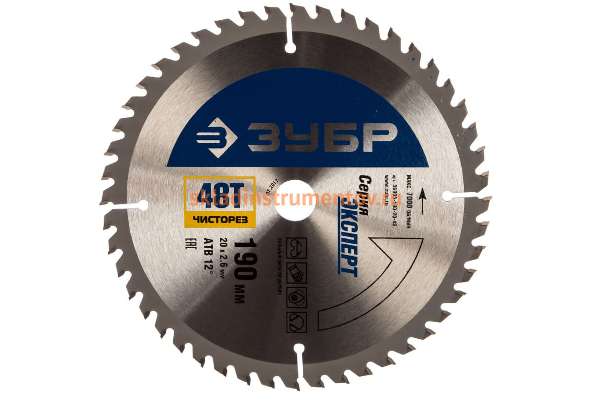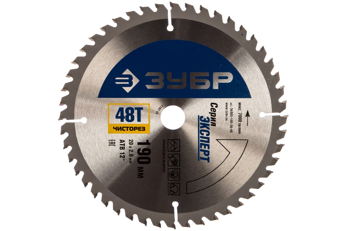 Пильный диск 36905-190-20-48 Зубр серии "Чистый рез" используется с циркулярными пилами. Оснастка применяется для пиления древесины различных пород, а также ДСП, панелей с покрытием и др. С помощью диска осуществляется поперечная и продольная обработка заготовок. Отшлифованные зубья оснащены твердосплавными пластинами (ВК8), за счет чего появляется возможность распиливать даже особо прочные заготовки, не теряя при этом качество реза. Зубья диска выполнены в форме вершины, а скос составляет 12°, за счет чего достигается максимально качественное пиление древесины. Еще одной особенностью является заточка зубьев с трех сторон, что гарантирует их правильную геометрию, а значит и эффективную работу.