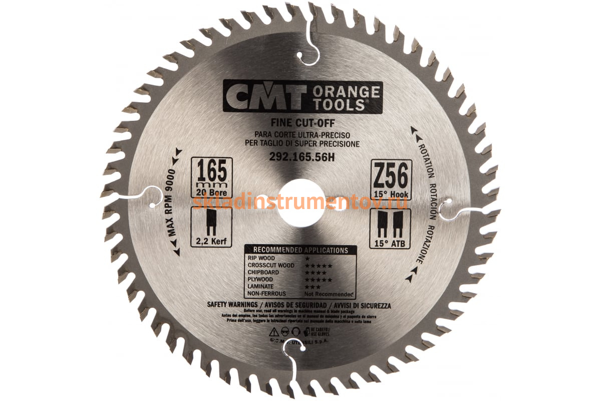 Пильный диск CMT 292.165.56H используется в дисковых пилах для поперечного реза мягкой или твердой древесины, панелей, покрытых ламинатом на бумажной основе, а также шпонированных панелей. Особая конфигурация зубьев (переменно-скошенные) позволяет работать мягко и эффективно.