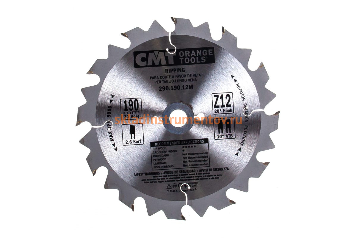 Пильный диск CMT 290.190.12M используют в ручных циркулярных, аккумуляторных и торцовочных пилах. Благодаря переменно-скошенным зубьям и углу врезания, который равен 20-ти градусам, данная оснастка подходит для продольного пиления клееных стыков твёрдой и мягкой древесины, а также фанеры. Диск идеален как для автоматической, так и ручной подачи на малой скорости.