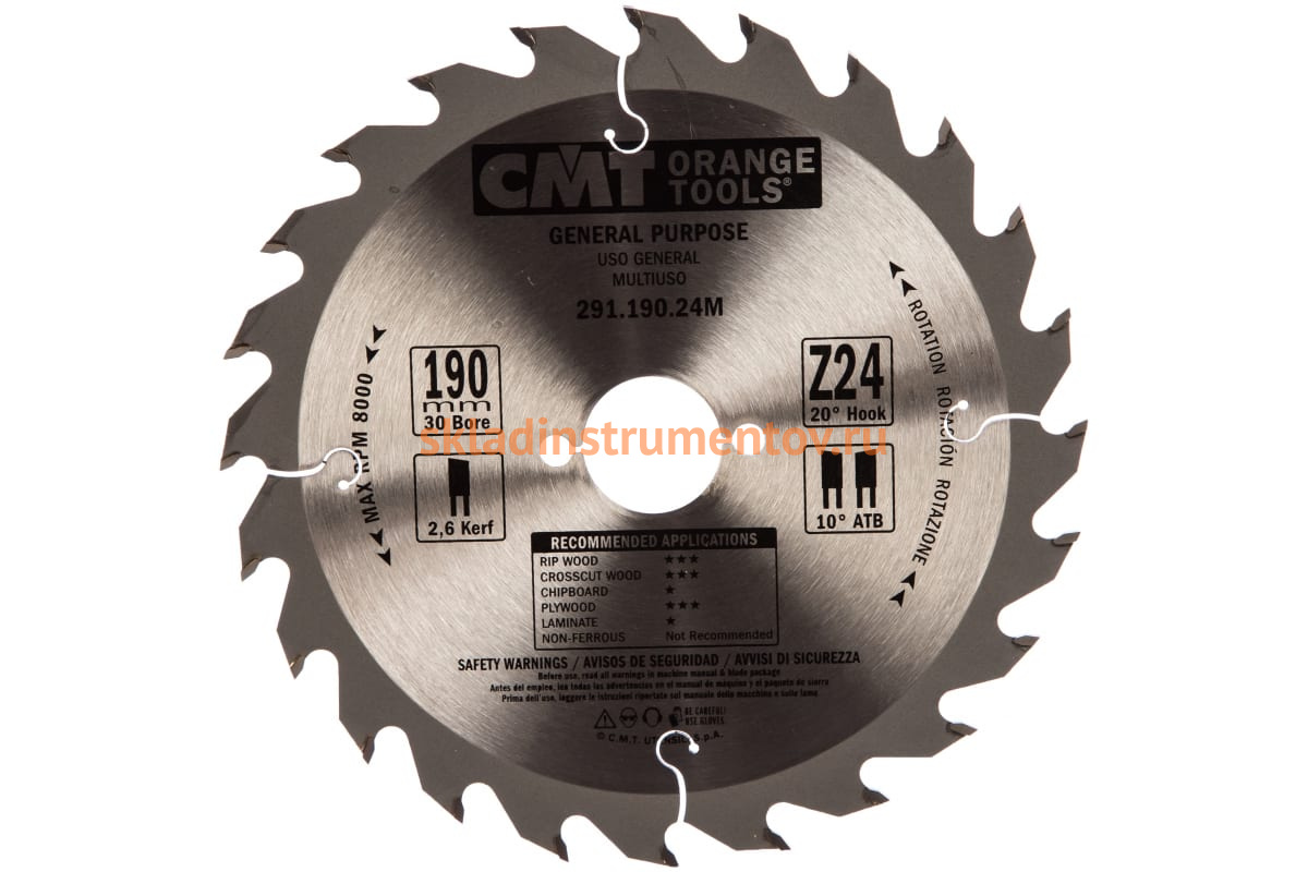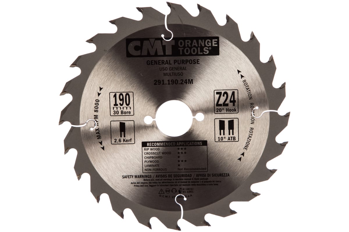 Пильный диск CMT 291.190.24M является универсальным. Его используют как для продольного, так и поперечного пиления древесины и фанеры. Диск оснащен отверстиями для крепления на большинстве инструментов. Зубья оснастки изготовлены из твердого сплава (К10). Благодаря особой конфигурации зубьев при работе данным диском достигается необходимая скорость пиления и эффективность.