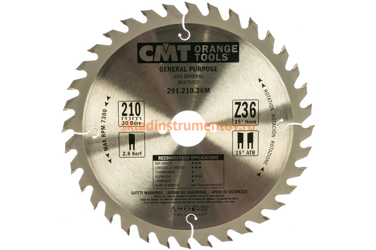 Пильный диск CMT 291.210.36M является универсальным. Его используют как для продольного, так и поперечного пиления древесины и фанеры. Диск оснащен отверстиями для крепления на большинстве инструментов. Зубья оснастки изготовлены из твердого сплава (К10). Благодаря особой конфигурации зубьев при работе данным диском достигается необходимая скорость пиления и эффективность.